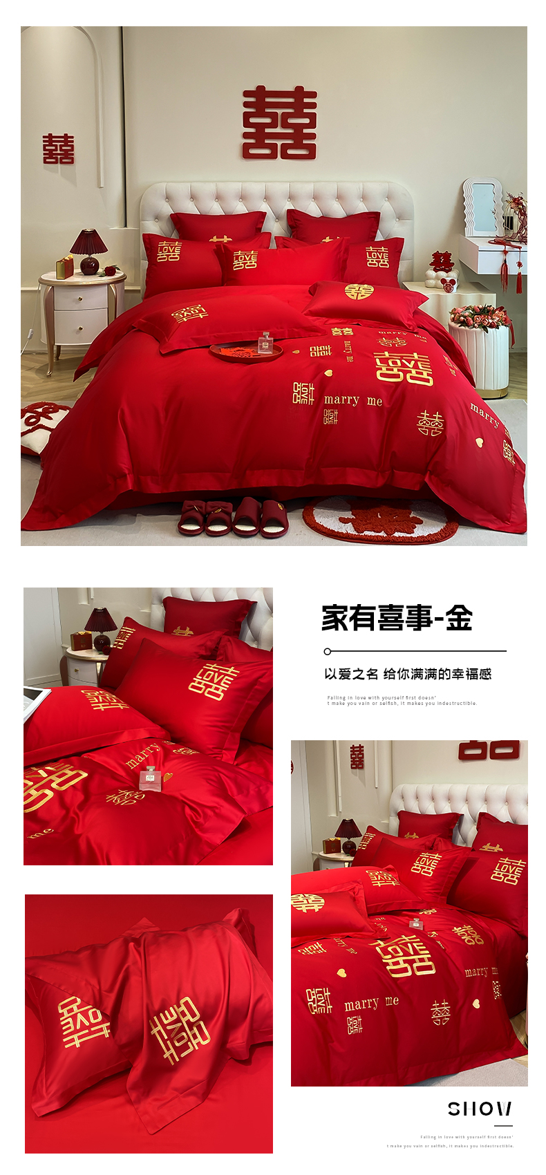 (总)欧乐蒂 2025新款高支高密提花婚庆四件套,龙凤美满,玫瑰情缘,双囍-红,双囍-金,叶叶情深