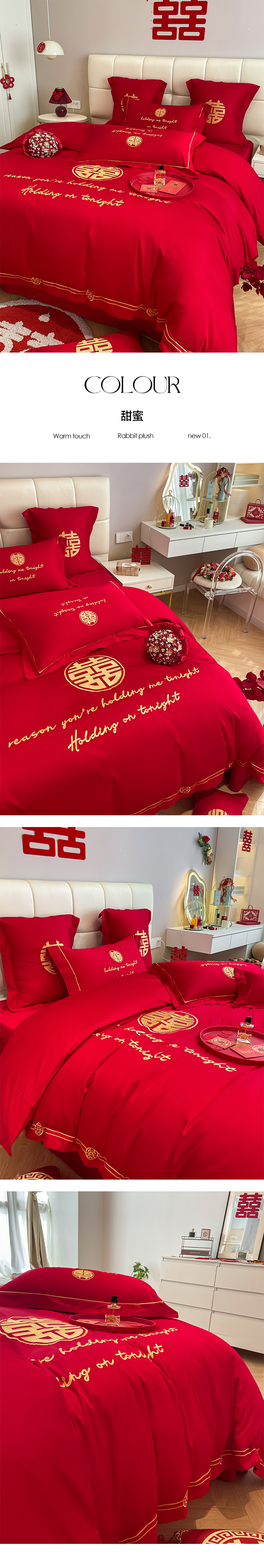 (总)欧乐蒂 2025新款婚庆款牛奶绒刺绣系列四件套-爱相随,爱相随-喜红,爱相随-金