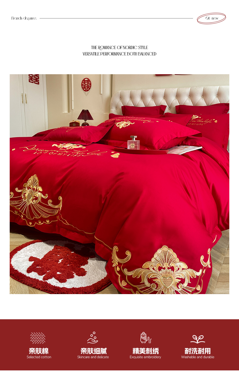 (总)欧乐蒂 2025新款亲肤棉刺绣花边婚庆四件套-浪漫花季,浪漫花季-红,浪漫花季-金