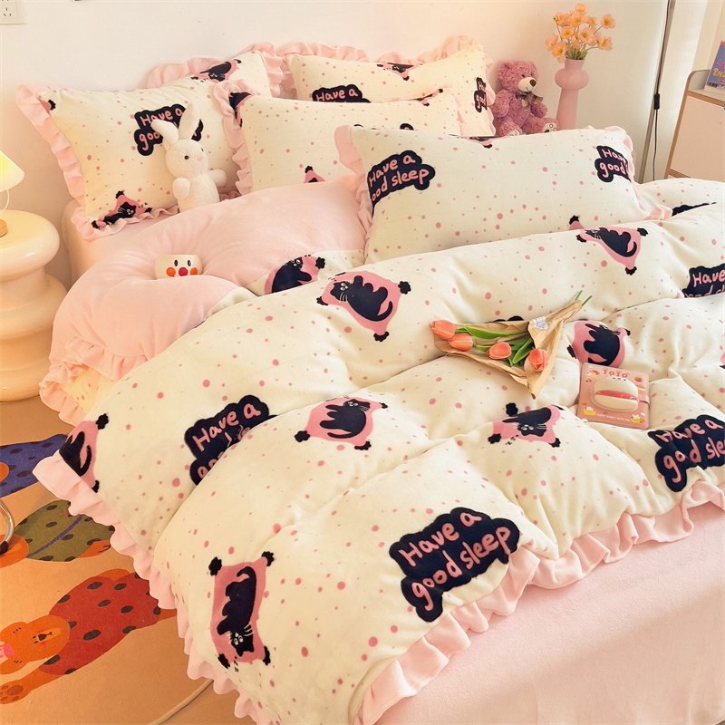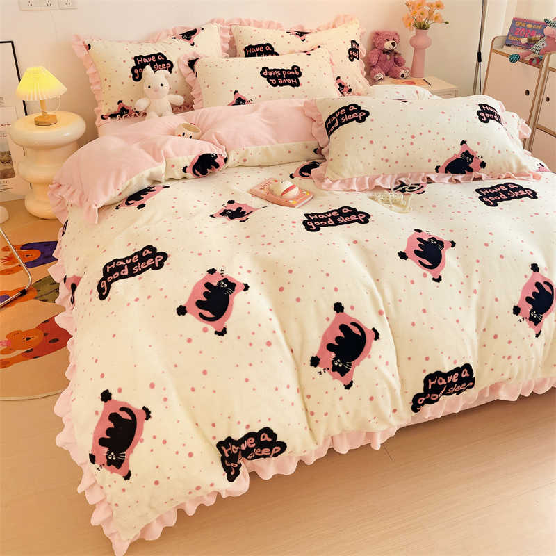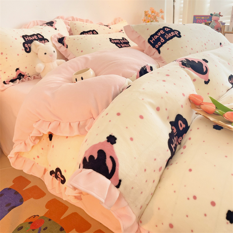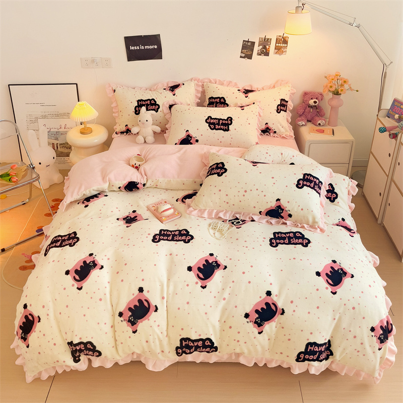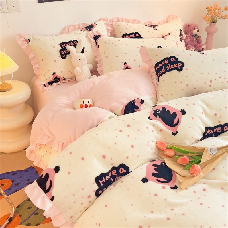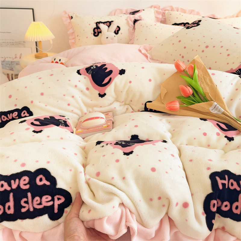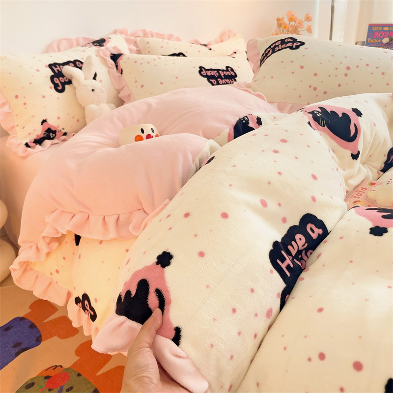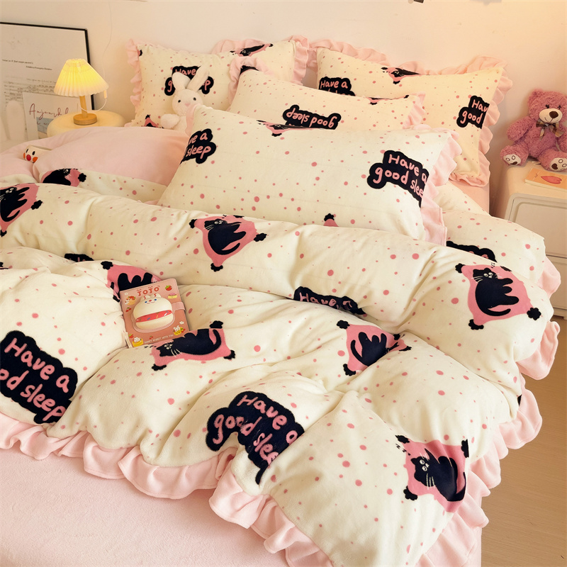 麦朵 2024高克重牛奶绒花边款四件套雪花绒金貂绒套件宝宝绒雕花绒被套 晚安猫
