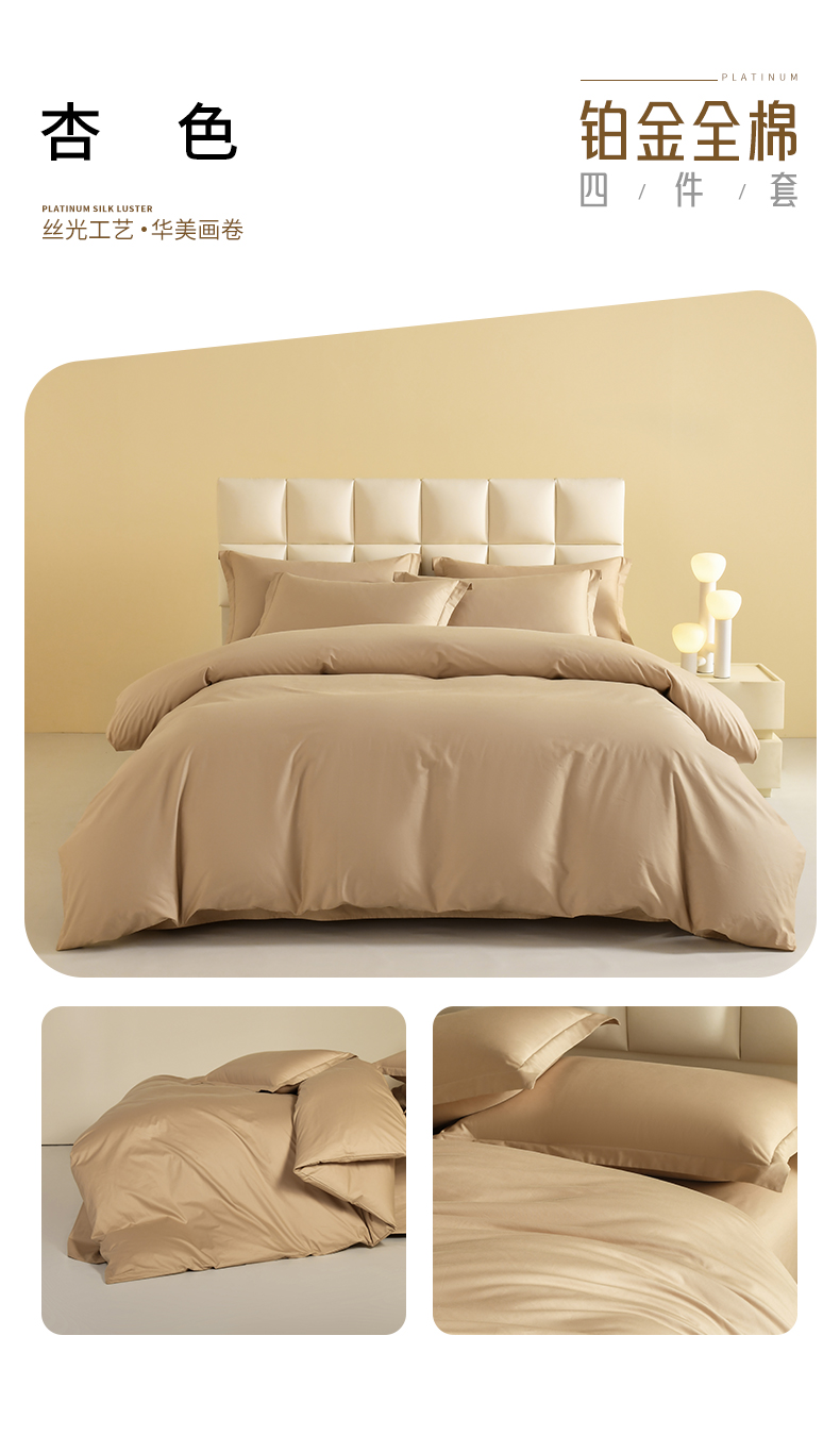 当前位置: 91家纺网 > 商品网购 > 床品套件 > 四件套 > 全棉活性四件套 > 元元被芯 2025款纯色全丝光-全精梳高密纺-铂金A类全棉四件套 杏色