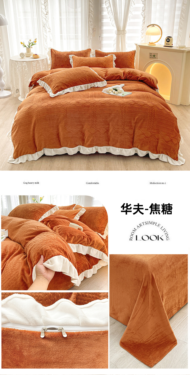 商品名称:雅萱家纺 2024新款高克重牛奶绒雕花四件套-华夫 华夫-焦糖