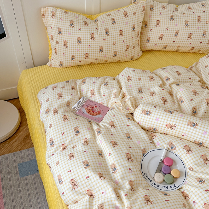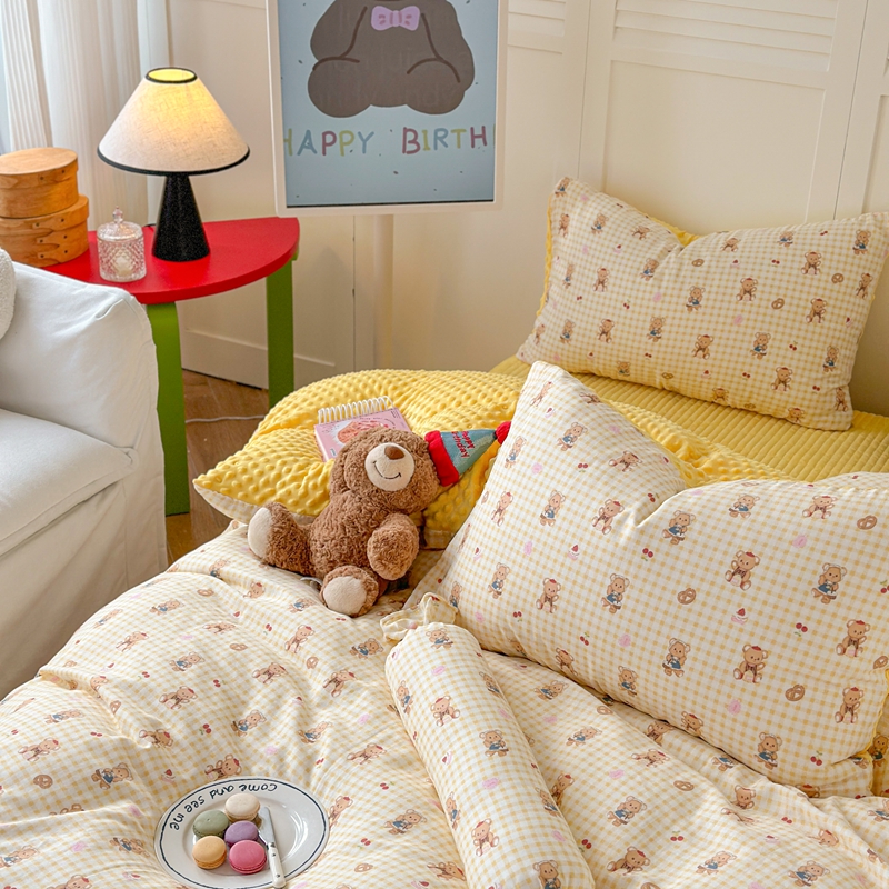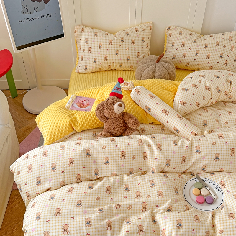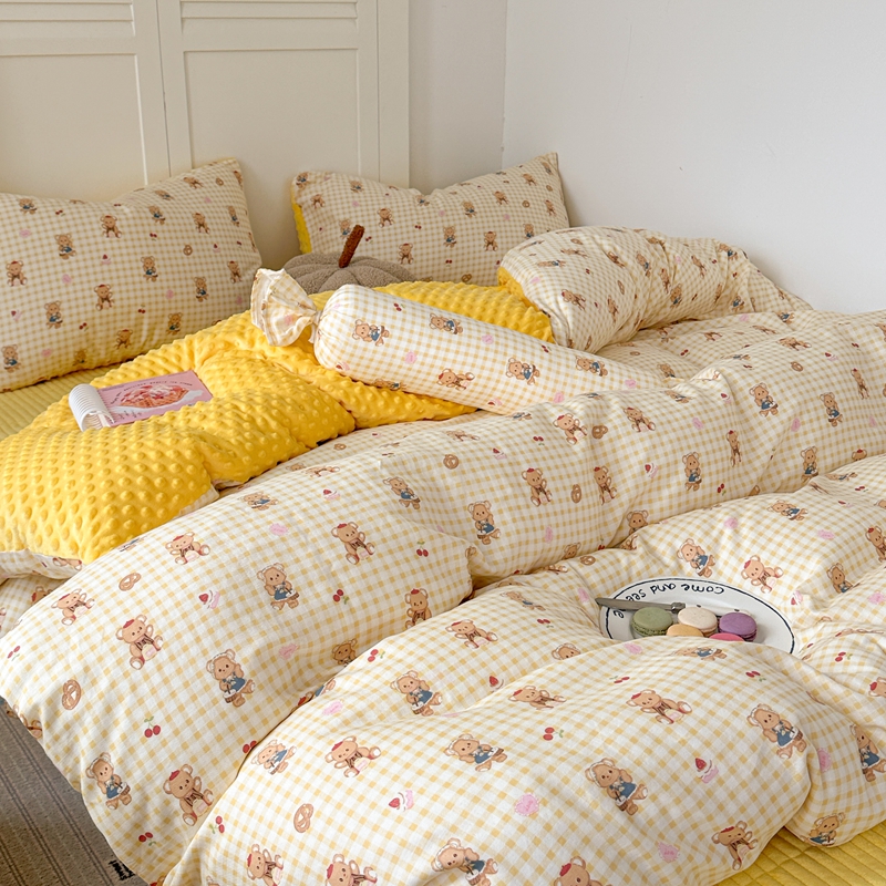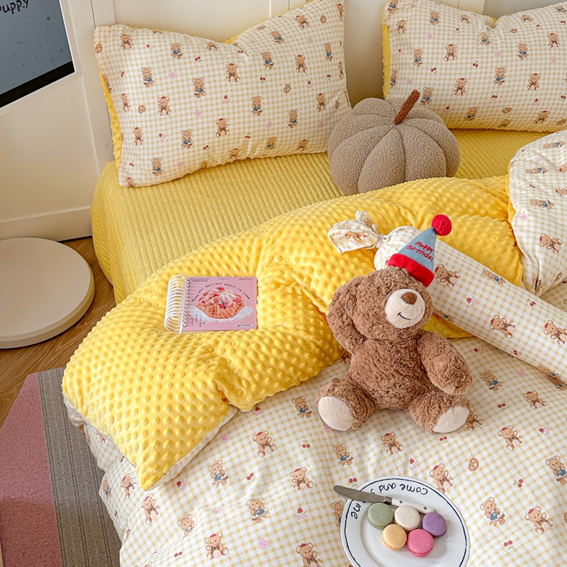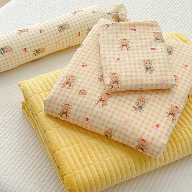商品名称:柚子YOUTH 2024新款全棉双层纱豆豆婴儿绒床盖四件套 黄格小熊