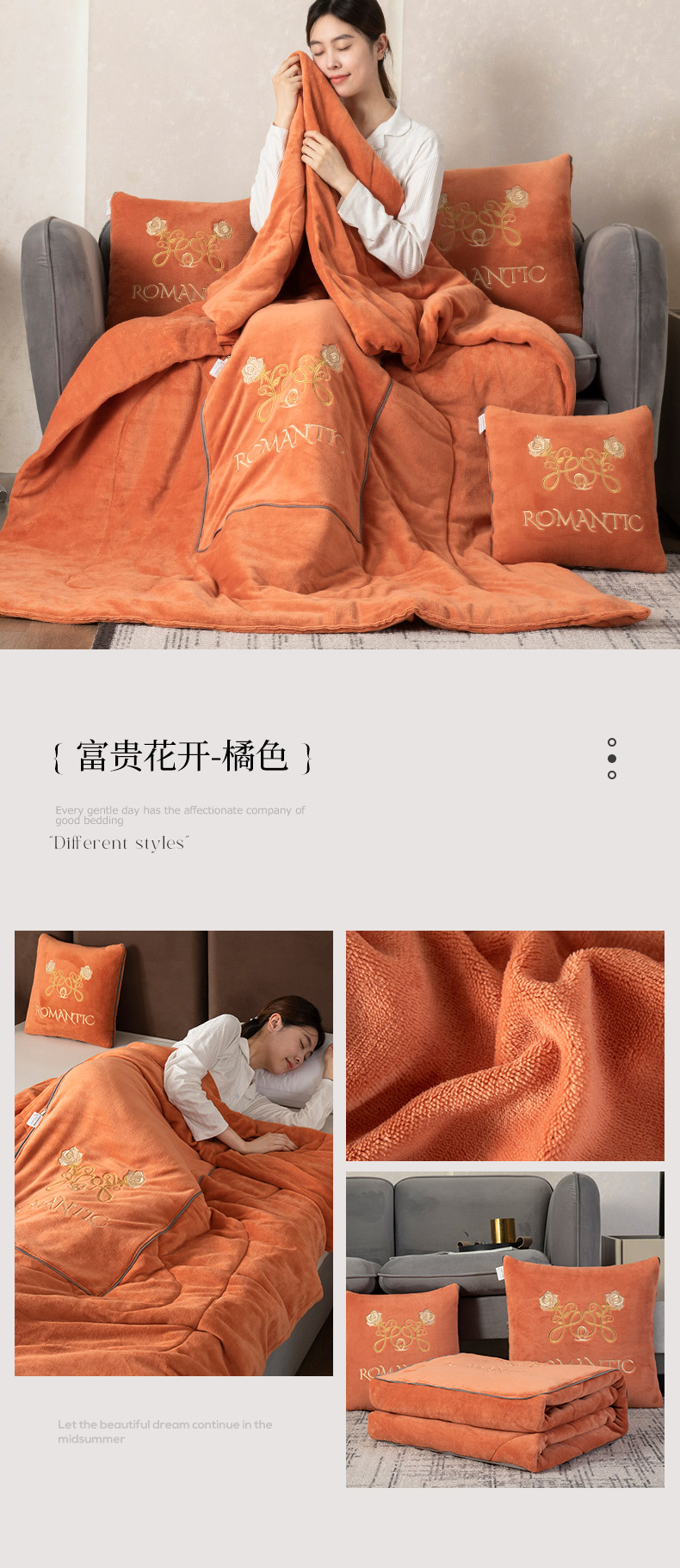 商品名称:雷人家纺 2023新款富贵花开牛奶绒刺绣多功能抱枕被 富贵花开-橘色