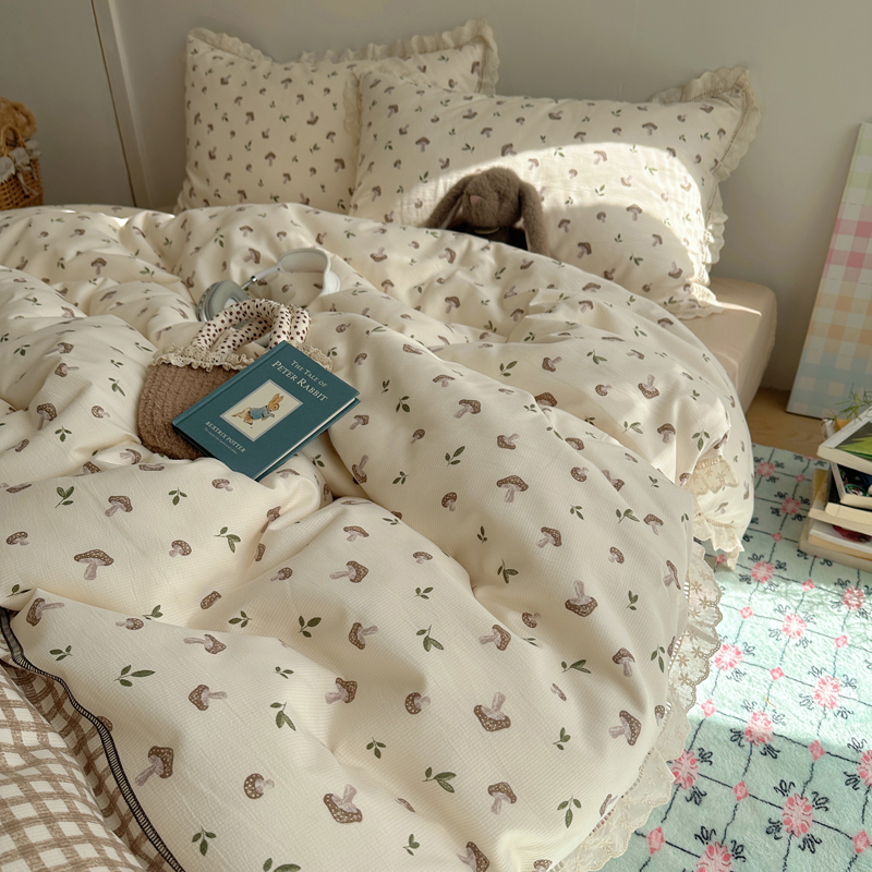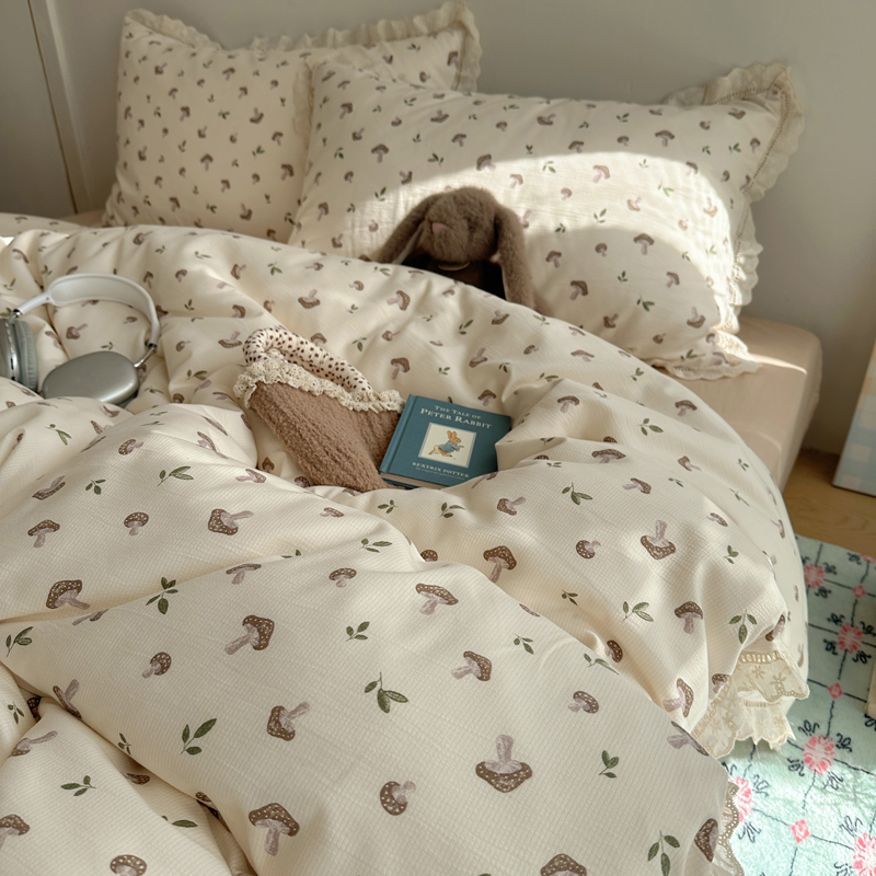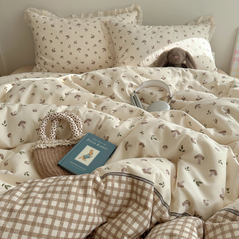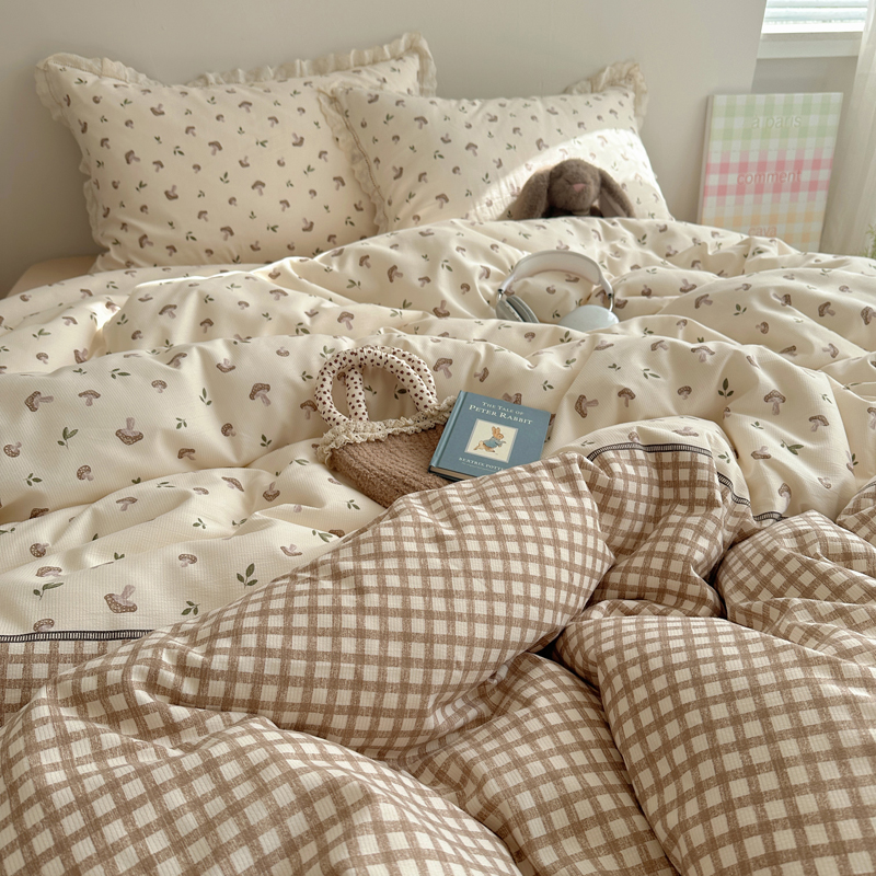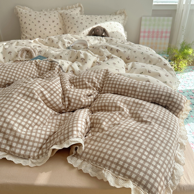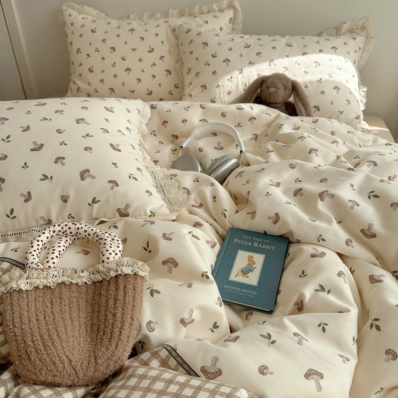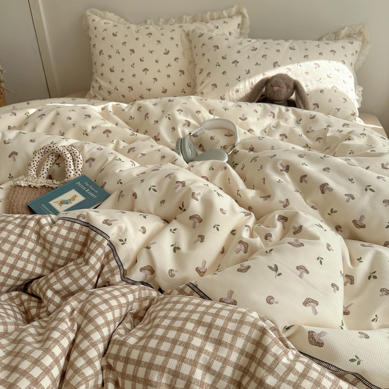 2025新款春日碎花云朵泡泡纱花边套件 咖格蘑菇