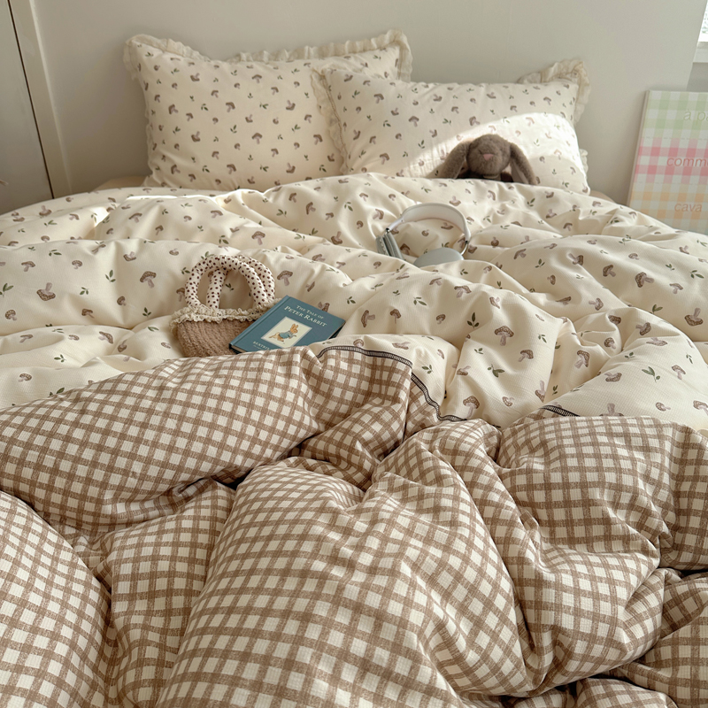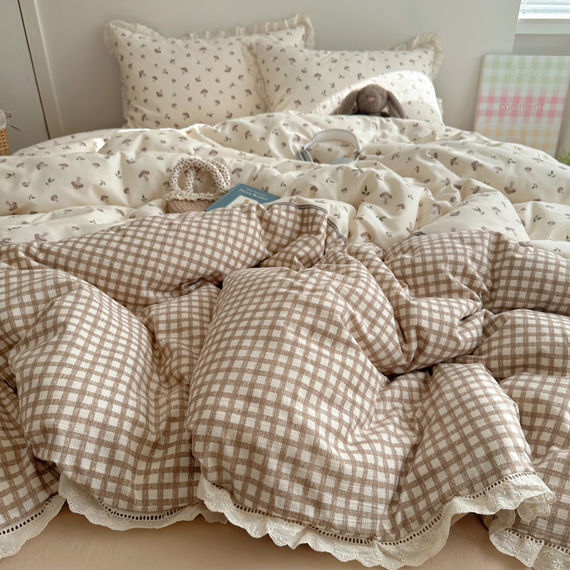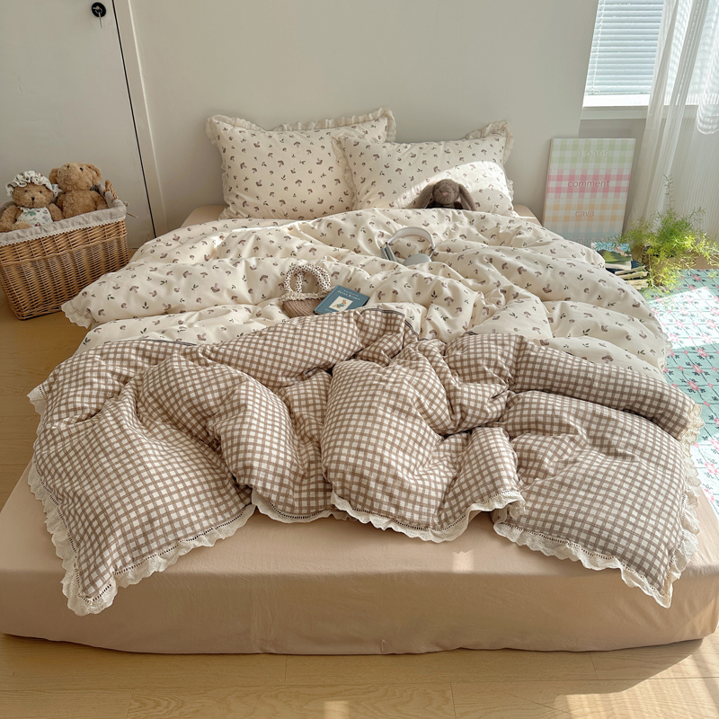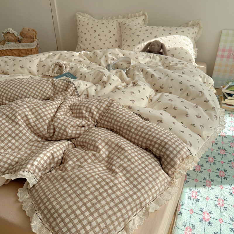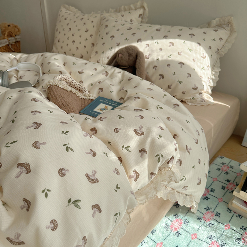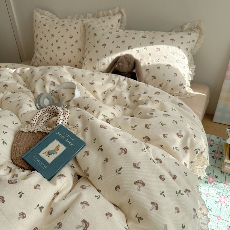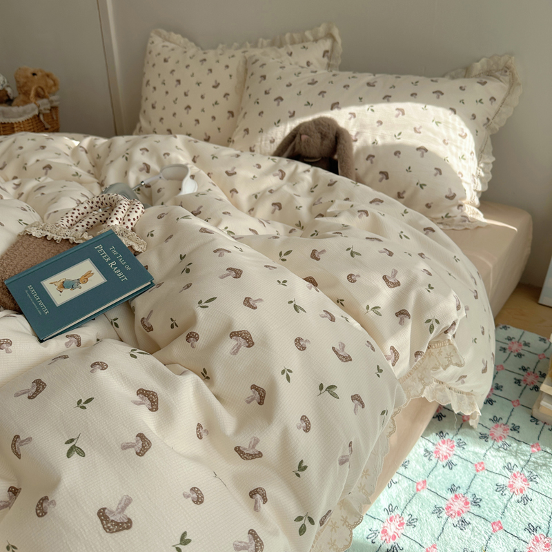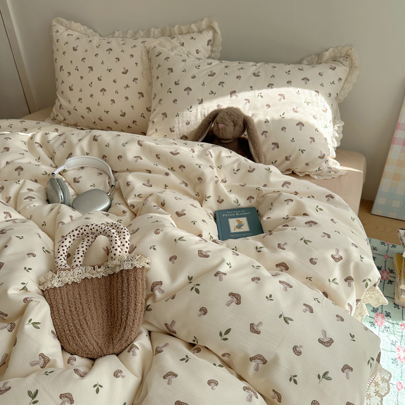 2025新款春日碎花云朵泡泡纱花边套件 咖格蘑菇