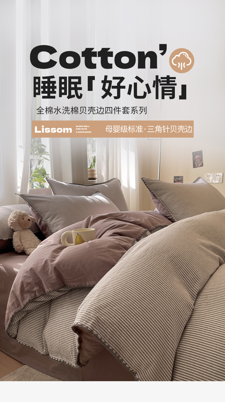 商品名称:蓝邻家纺 2025年新款全棉水洗棉贝壳边四件套系列 佐伊灰