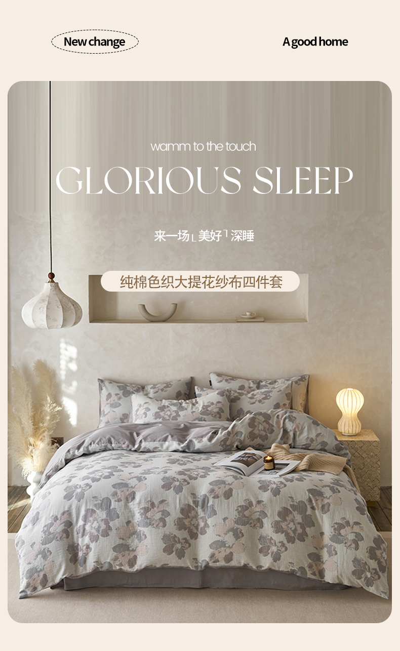 (总)宜代光年 2026新款60S水洗棉全棉纯棉三层纱色织提花夏被四件套系列,繁花-粉,繁花-灰,繁花-咖,繁花-绿,繁花-紫,海棠,林逾静-灰,林逾静-橘,牡丹-粉,牡丹-咖,执笔水墨-灰,执笔水墨-咖