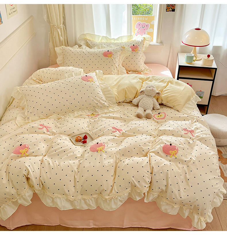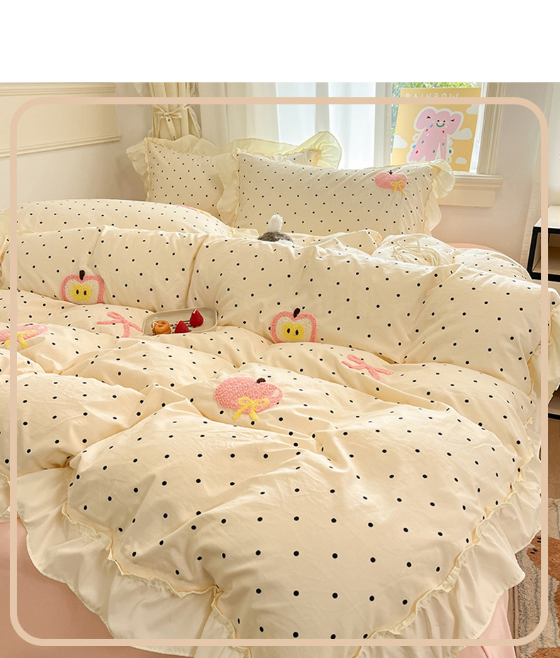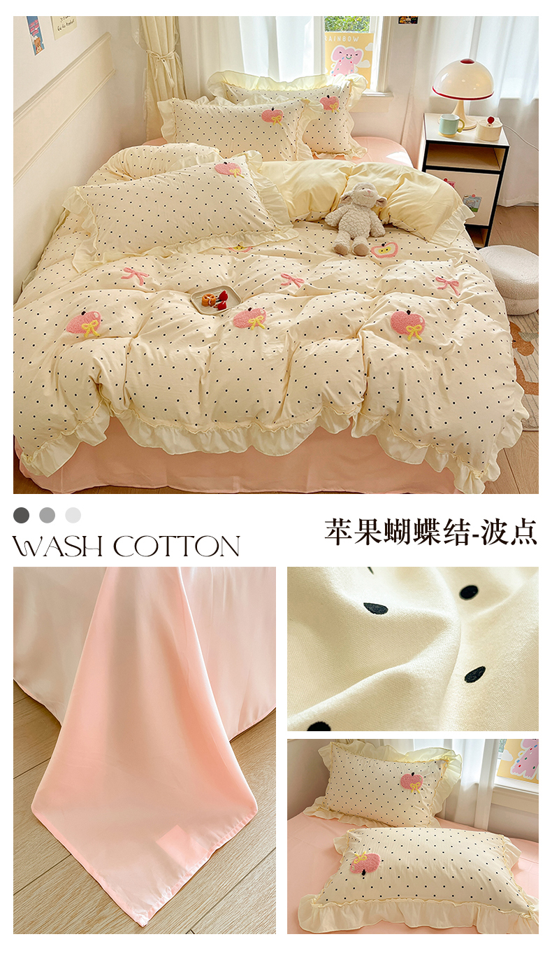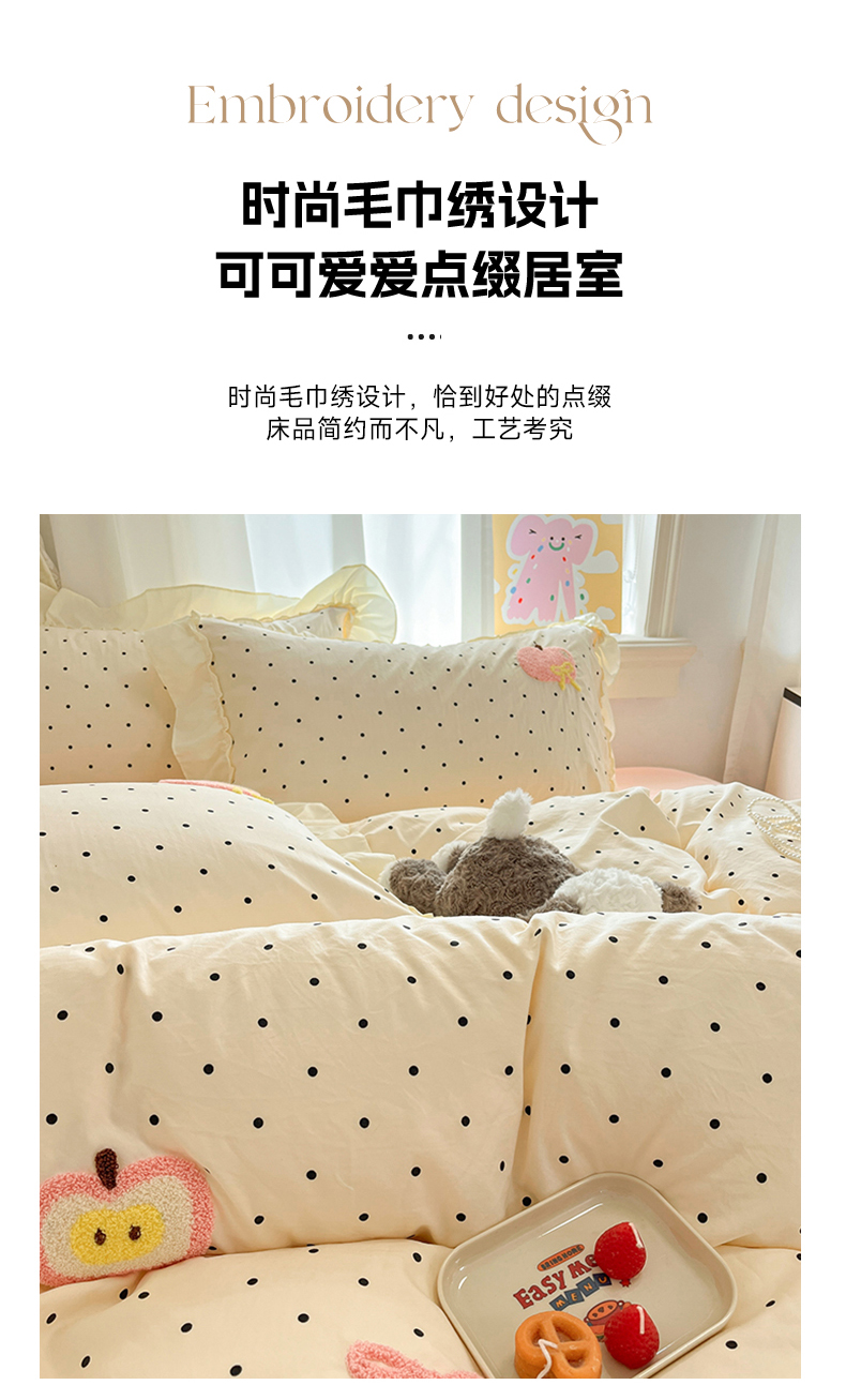 当前位置: 91家纺网 > 商品网购 > 床品套件 > 四件套 > 水洗棉四件套 > 我心家纺 2025新款水洗棉毛巾绣四件套-苹果系列 苹果蝴蝶结-波点