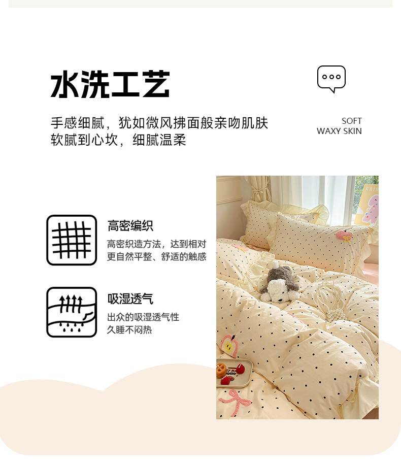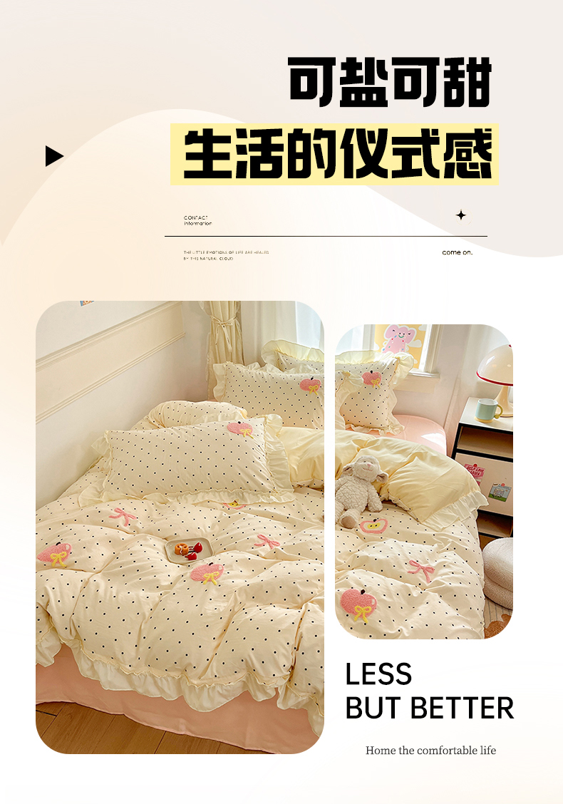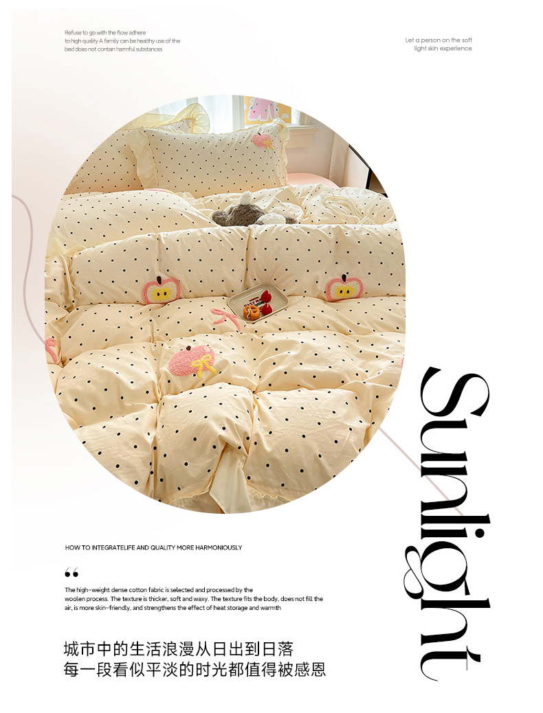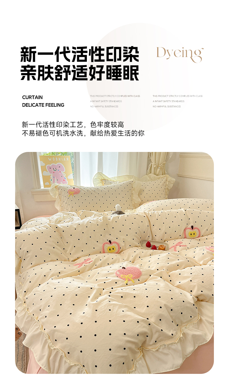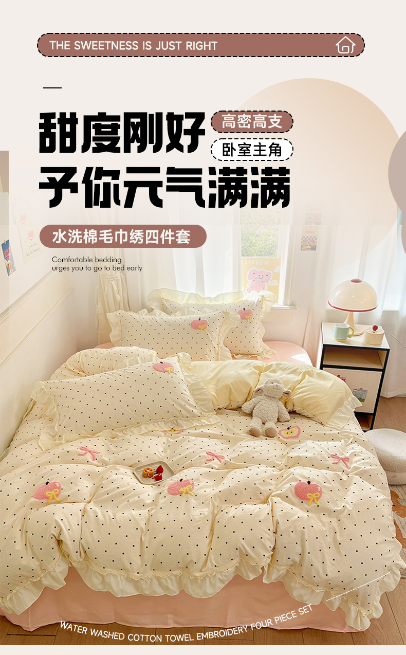 当前位置: 91家纺网 > 商品网购 > 床品套件 > 四件套 > 水洗棉四件套 > 我心家纺 2025新款水洗棉毛巾绣四件套-苹果系列 苹果蝴蝶结-波点