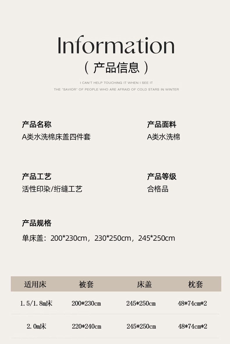 2.0米床盖四件套:被套220*240cm,床盖245*250cm