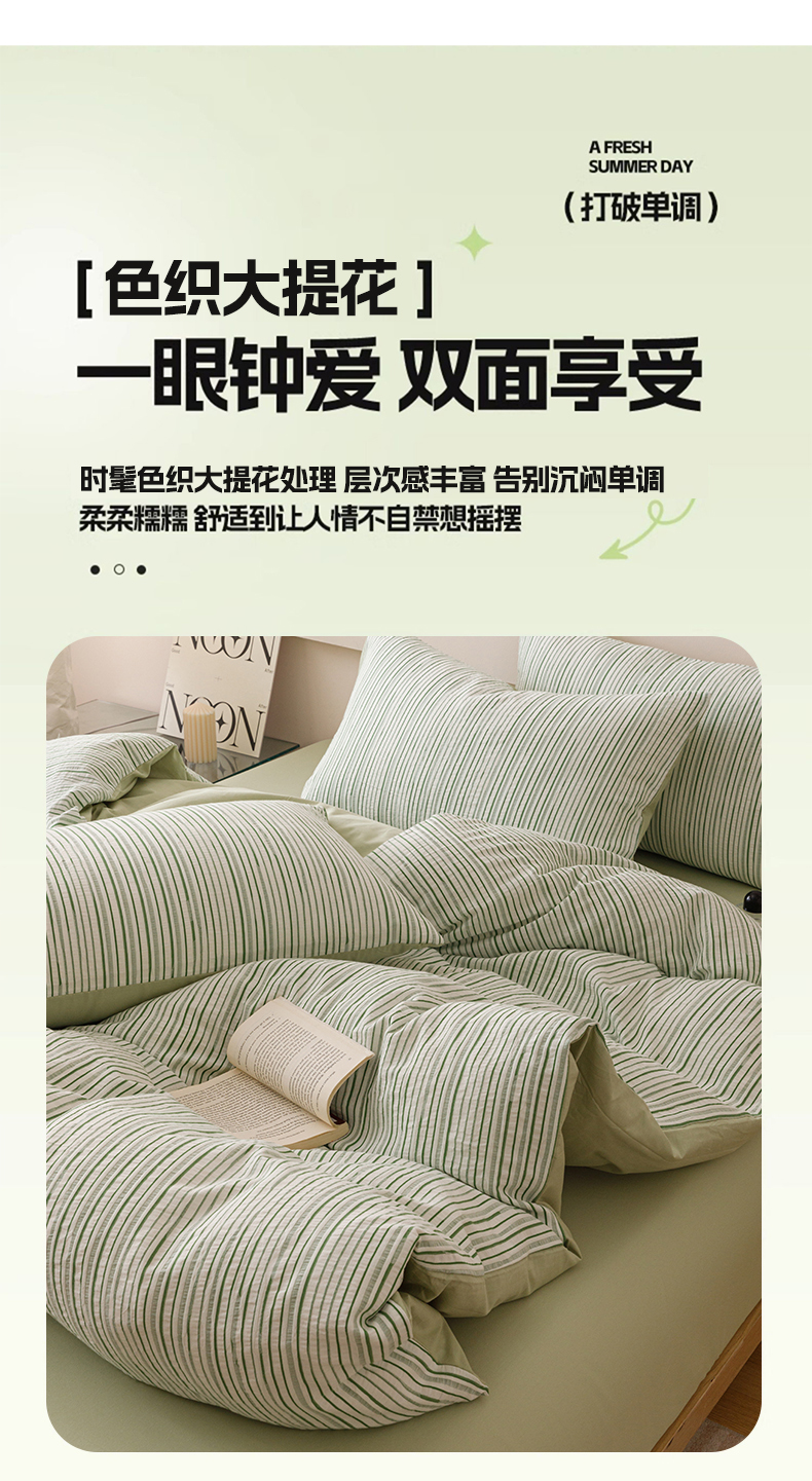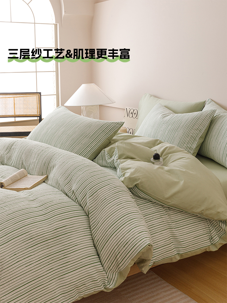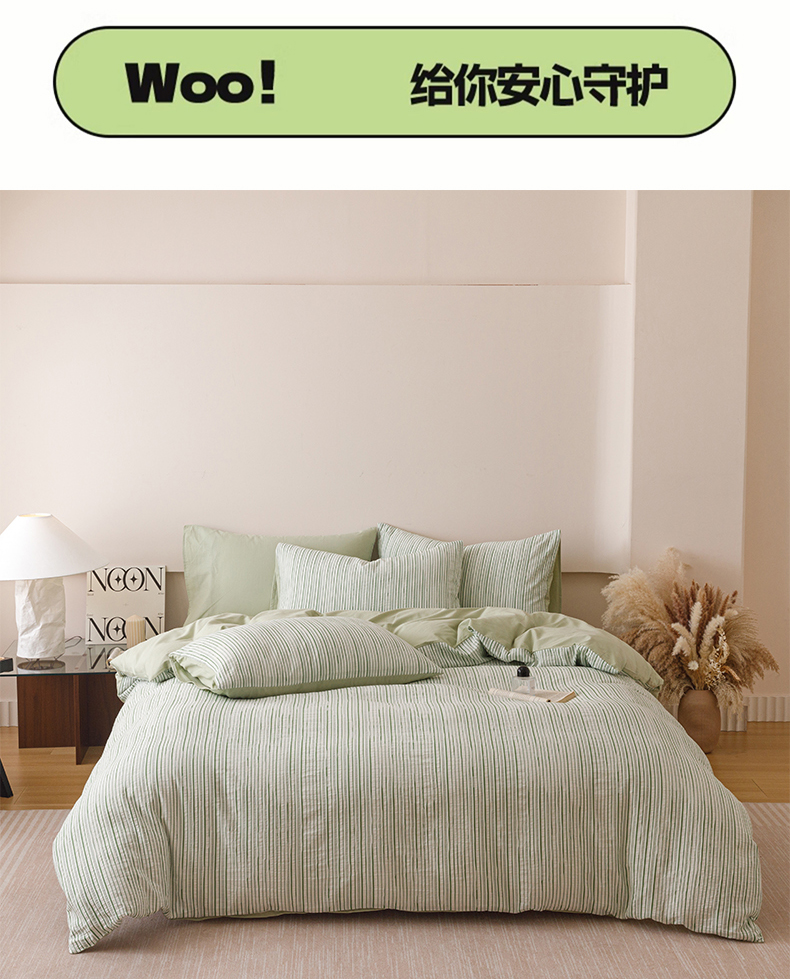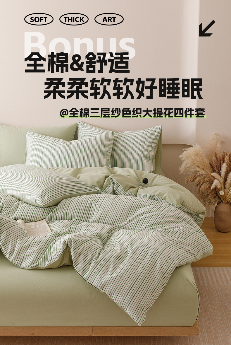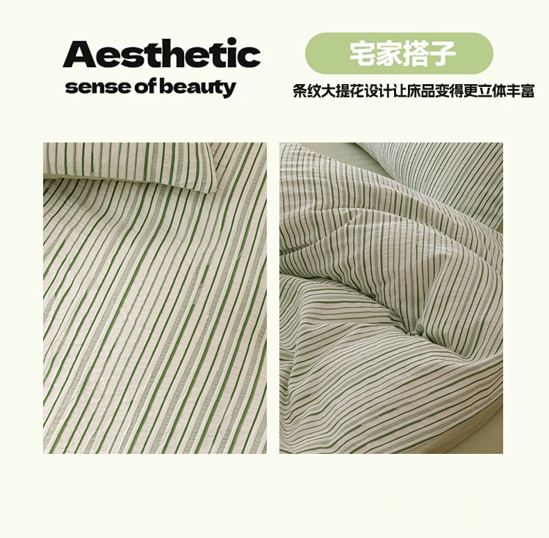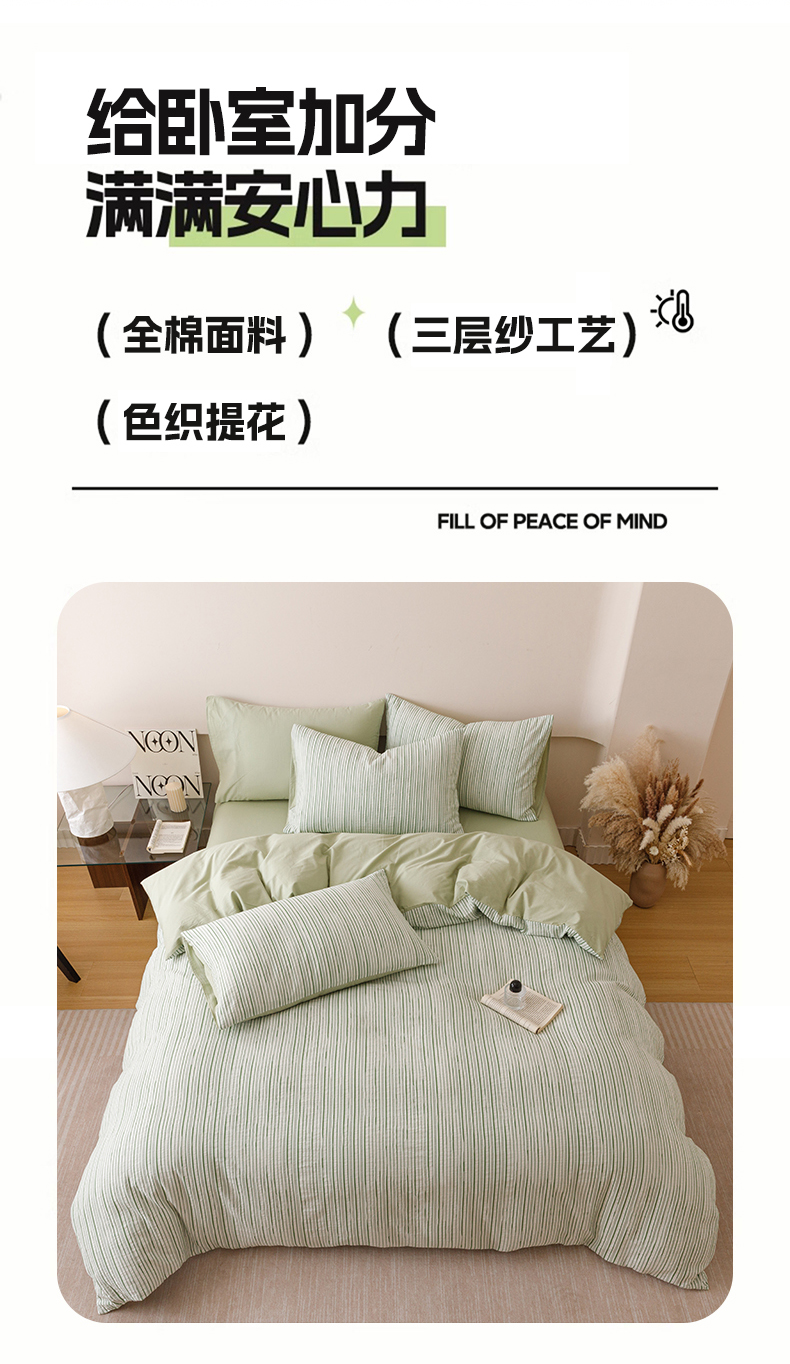 商品名称:忆生活家纺 2025新款全棉三层纱色织大提花条纹款四件套 初恋-抹茶绿