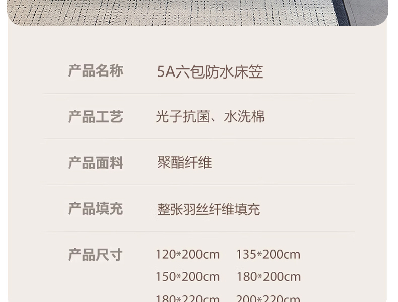 [{"sp_id":11,"sp_name":"\u989c\u8272\u5206\u7c7b","sp_format":2,"sp_list":[{"sp_value_id":651,"sp_value_name":"\u83b9\u6708\u767d-\u5c0f\u683c\u5b50\u9632\u6c34\u6b3e","sp_value_image":{"id":999,"path":"https:\/\/img3.91jf.com\/ghelp\/2025\/20250318\/29dc20e4-236c-4249-a0d6-bd5e566bff3620250318184555355.jpg_30_30.jpg"},"sp_value_video":{"id":0,"img":"","path":"","time":0,"download_num":0,"play_num":0},"price":"50.00","storage":9500,"weight":"1.500","is_check_weight":0,"plus_price":"","sp_sort":3}]},{"sp_id":24,"sp_name":"\u5e8a\u5355\/\u5e8a\u7b20\u5c3a\u5bf8","sp_format":1,"sp_list":[{"sp_value_id":213,"sp_value_name":"120*200cm+15cm","sp_value_image":{"id":0,"path":""},"sp_value_video":{"id":0,"img":"","path":"","time":0,"download_num":0,"play_num":0},"price":"50.00","storage":500,"weight":"1.500","is_check_weight":0,"plus_price":"","sp_sort":5},{"sp_value_id":214,"sp_value_name":"120*200cm+20cm","sp_value_image":{"id":0,"path":""},"sp_value_video":{"id":0,"img":"","path":"","time":0,"download_num":0,"play_num":0},"price":"50.00","storage":500,"weight":"1.500","is_check_weight":0,"plus_price":"","sp_sort":6},{"sp_value_id":215,"sp_value_name":"120*200cm+25cm","sp_value_image":{"id":0,"path":""},"sp_value_video":{"id":0,"img":"","path":"","time":0,"download_num":0,"play_num":0},"price":"50.00","storage":500,"weight":"1.500","is_check_weight":0,"plus_price":"","sp_sort":7},{"sp_value_id":216,"sp_value_name":"150*200cm+10cm","sp_value_image":{"id":0,"path":""},"sp_value_video":{"id":0,"img":"","path":"","time":0,"download_num":0,"play_num":0},"price":"58.00","storage":500,"weight":"1.500","is_check_weight":0,"plus_price":"","sp_sort":8},{"sp_value_id":217,"sp_value_name":"150*200cm+15cm","sp_value_image":{"id":0,"path":""},"sp_value_video":{"id":0,"img":"","path":"","time":0,"download_num":0,"play_num":0},"price":"58.00","storage":500,"weight":"1.500","is_check_weight":0,"plus_price":"","sp_sort":9},{"sp_value_id":218,"sp_value_name":"150*200cm+20cm","sp_value_image":{"id":0,"path":""},"sp_value_video":{"id":0,"img":"","path":"","time":0,"download_num":0,"play_num":0},"price":"58.00","storage":500,"weight":"1.500","is_check_weight":0,"plus_price":"","sp_sort":10},{"sp_value_id":219,"sp_value_name":"150*200cm+23cm","sp_value_image":{"id":0,"path":""},"sp_value_video":{"id":0,"img":"","path":"","time":0,"download_num":0,"play_num":0},"price":"58.00","storage":500,"weight":"1.500","is_check_weight":0,"plus_price":"","sp_sort":11},{"sp_value_id":220,"sp_value_name":"150*200cm+25cm","sp_value_image":{"id":0,"path":""},"sp_value_video":{"id":0,"img":"","path":"","time":0,"download_num":0,"play_num":0},"price":"58.00","storage":500,"weight":"1.500","is_check_weight":0,"plus_price":"","sp_sort":12},{"sp_value_id":221,"sp_value_name":"180*200cm+10cm","sp_value_image":{"id":0,"path":""},"sp_value_video":{"id":0,"img":"","path":"","time":0,"download_num":0,"play_num":0},"price":"62.00","storage":500,"weight":"1.500","is_check_weight":0,"plus_price":"","sp_sort":13},{"sp_value_id":222,"sp_value_name":"180*200cm+15cm","sp_value_image":{"id":0,"path":""},"sp_value_video":{"id":0,"img":"","path":"","time":0,"download_num":0,"play_num":0},"price":"62.00","storage":500,"weight":"1.500","is_check_weight":0,"plus_price":"","sp_sort":14},{"sp_value_id":223,"sp_value_name":"180*200cm+20cm","sp_value_image":{"id":0,"path":""},"sp_value_video":{"id":0,"img":"","path":"","time":0,"download_num":0,"play_num":0},"price":"62.00","storage":500,"weight":"1.500","is_check_weight":0,"plus_price":"","sp_sort":15},{"sp_value_id":224,"sp_value_name":"180*200cm+23cm","sp_value_image":{"id":0,"path":""},"sp_value_video":{"id":0,"img":"","path":"","time":0,"download_num":0,"play_num":0},"price":"62.00","storage":500,"weight":"1.500","is_check_weight":0,"plus_price":"","sp_sort":16},{"sp_value_id":225,"sp_value_name":"180*200cm+25cm","sp_value_image":{"id":0,"path":""},"sp_value_video":{"id":0,"img":"","path":"","time":0,"download_num":0,"play_num":0},"price":"62.00","storage":500,"weight":"1.500","is_check_weight":0,"plus_price":"","sp_sort":17},{"sp_value_id":226,"sp_value_name":"180*220cm+20cm","sp_value_image":{"id":0,"path":""},"sp_value_video":{"id":0,"img":"","path":"","time":0,"download_num":0,"play_num":0},"price":"70.00","storage":500,"weight":"1.500","is_check_weight":0,"plus_price":"","sp_sort":18},{"sp_value_id":227,"sp_value_name":"180*220cm+25cm","sp_value_image":{"id":0,"path":""},"sp_value_video":{"id":0,"img":"","path":"","time":0,"download_num":0,"play_num":0},"price":"70.00","storage":500,"weight":"1.500","is_check_weight":0,"plus_price":"","sp_sort":19},{"sp_value_id":228,"sp_value_name":"200*220cm+20cm","sp_value_image":{"id":0,"path":""},"sp_value_video":{"id":0,"img":"","path":"","time":0,"download_num":0,"play_num":0},"price":"75.00","storage":500,"weight":"1.500","is_check_weight":0,"plus_price":"","sp_sort":20},{"sp_value_id":229,"sp_value_name":"200*220cm+25cm","sp_value_image":{"id":0,"path":""},"sp_value_video":{"id":0,"img":"","path":"","time":0,"download_num":0,"play_num":0},"price":"75.00","storage":500,"weight":"1.500","is_check_weight":0,"plus_price":"","sp_sort":21},{"sp_value_id":804,"sp_value_name":"\u6795\u5957\u4e00\u5bf9","sp_value_image":{"id":0,"path":""},"sp_value_video":{"id":0,"img":"","path":"","time":0,"download_num":0,"play_num":0},"price":"18.00","storage":500,"weight":"0.400","is_check_weight":0,"plus_price":"","sp_sort":22},{"sp_value_id":805,"sp_value_name":"\u6795\u5957\u4e00\u53ea","sp_value_image":{"id":0,"path":""},"sp_value_video":{"id":0,"img":"","path":"","time":0,"download_num":0,"play_num":0},"price":"9.00","storage":500,"weight":"0.200","is_check_weight":0,"plus_price":"","sp_sort":23}]}]