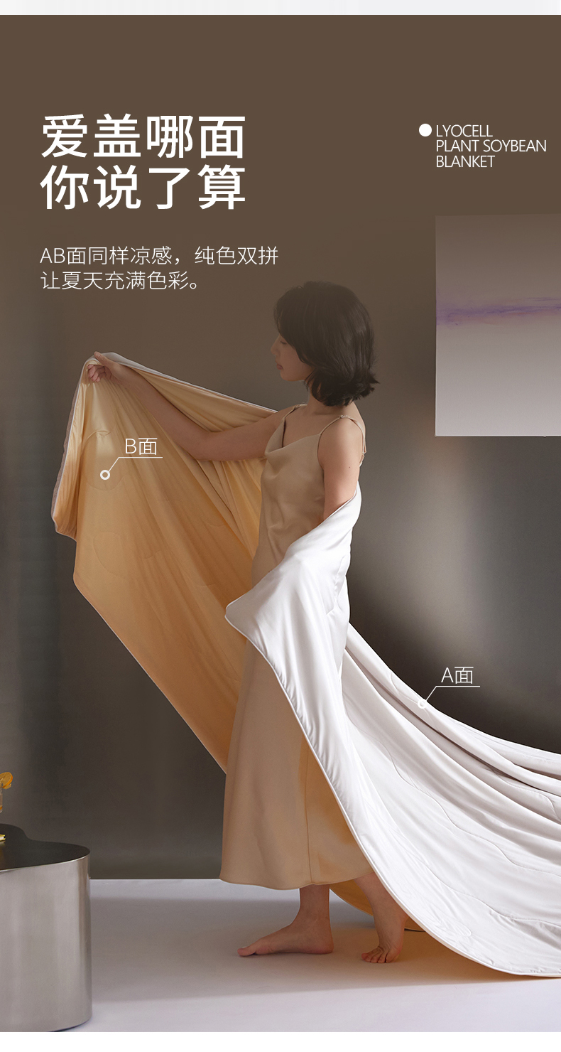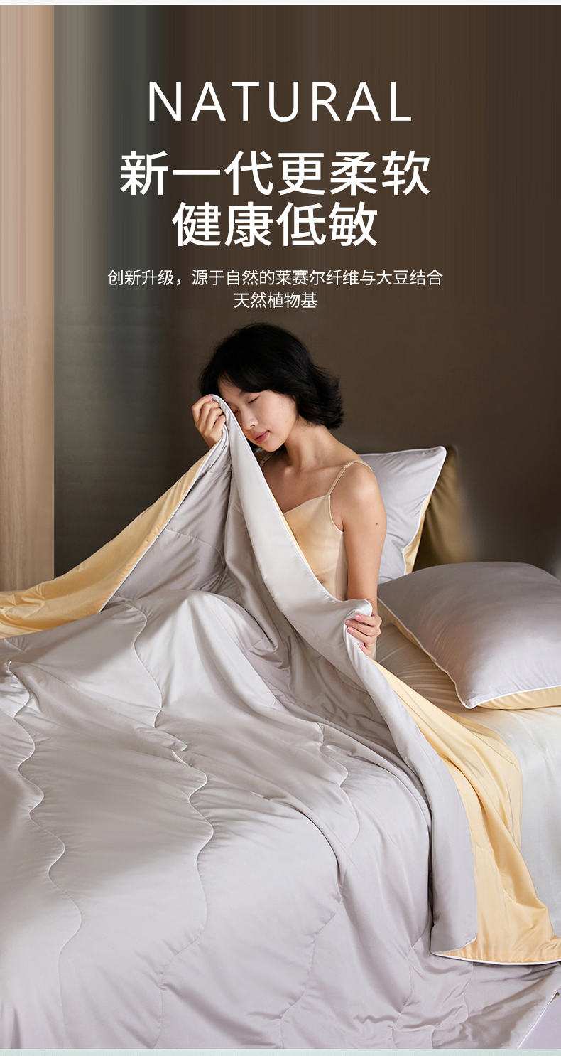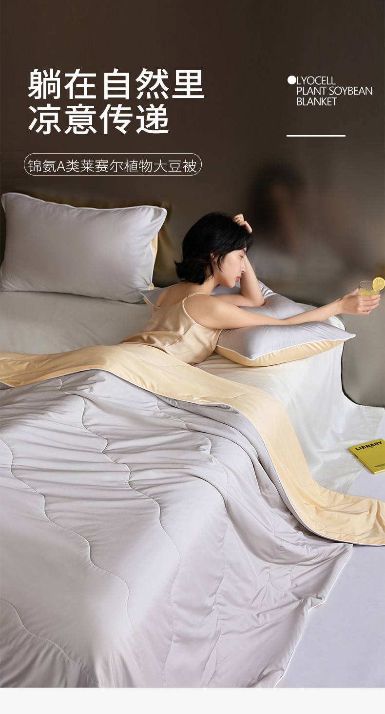 被子 > 夏被 > 头等舱 2025新款锦氨(165克)水光亮面锦A类55莱赛尔植物大豆7A抗菌夏凉被夏被(模特图) 银灰+暖黄
