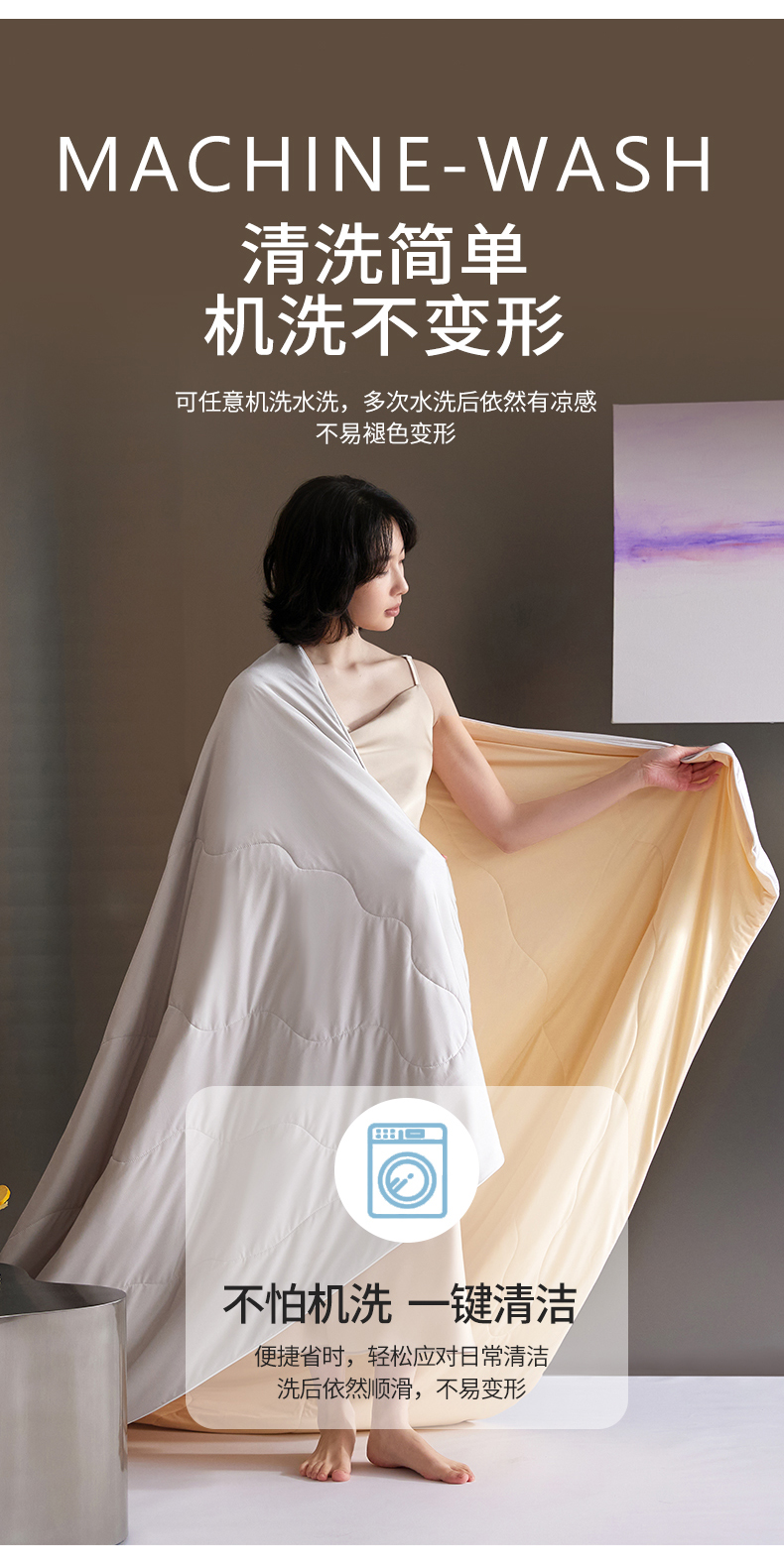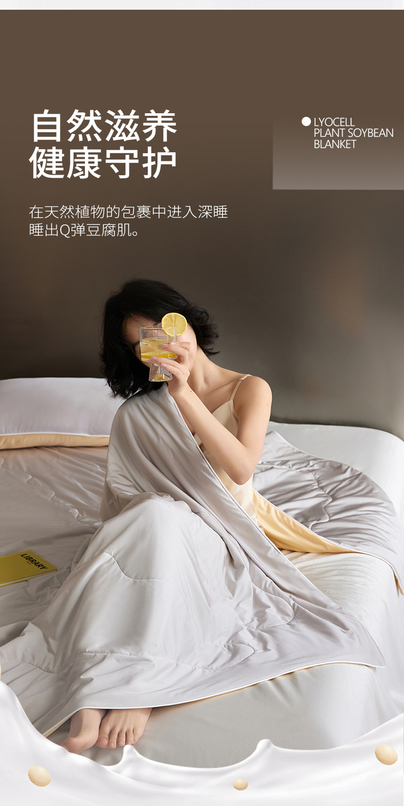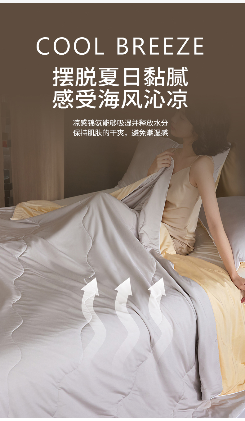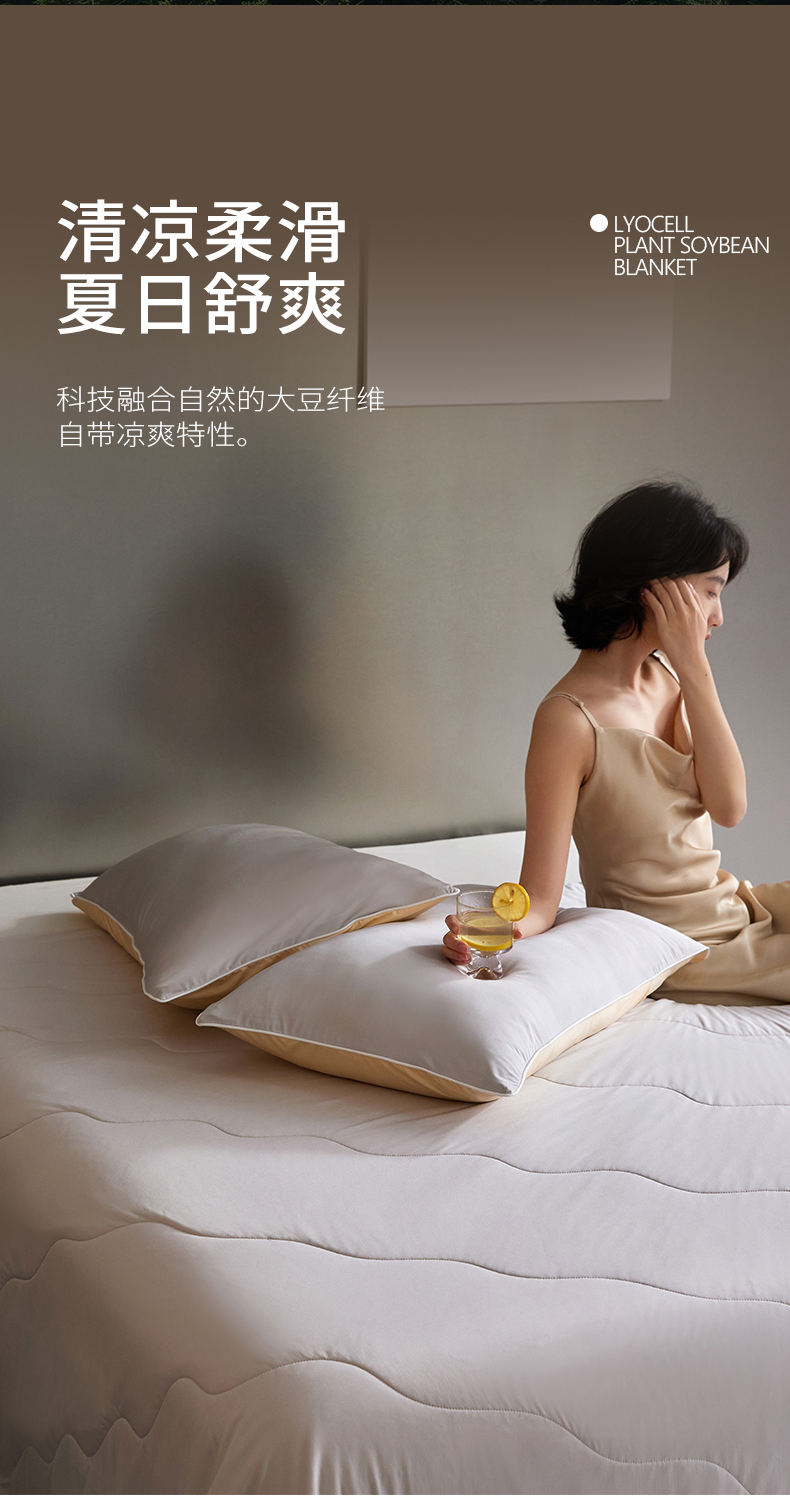 被子 > 夏被 > 头等舱 2025新款锦氨(165克)水光亮面锦A类55莱赛尔植物大豆7A抗菌夏凉被夏被(模特图) 银灰+暖黄