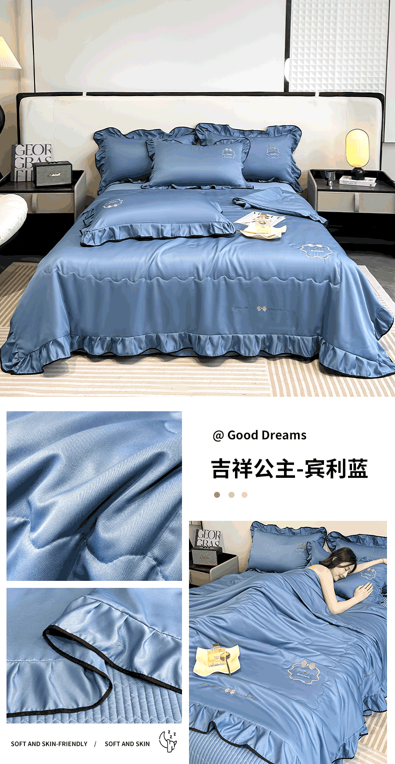 商品名称:富米莱 2025新款韩版水洗真丝冰丝刺绣夏被夏凉被空调被床盖四件套 吉祥公主-宾利蓝