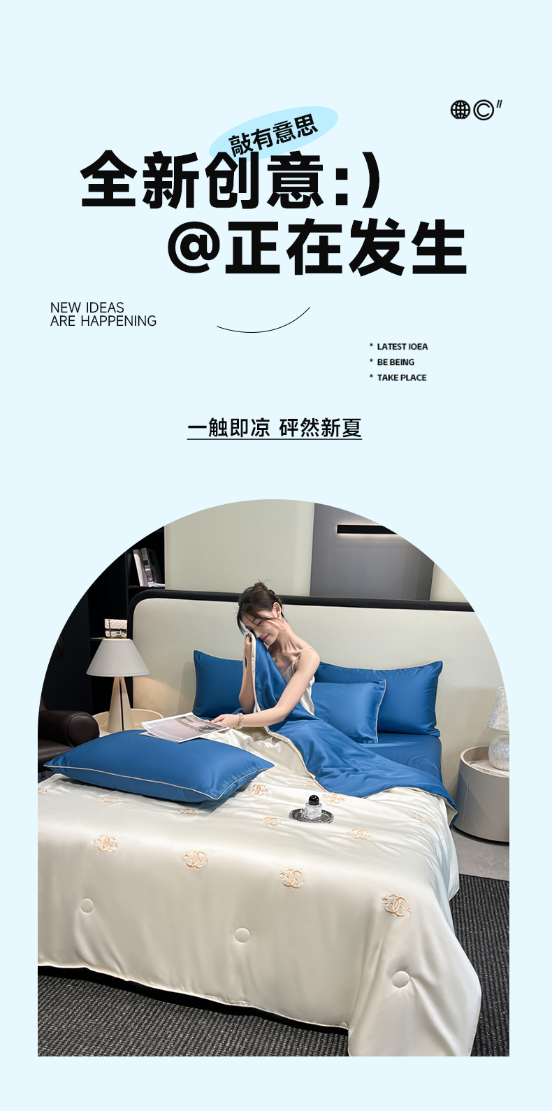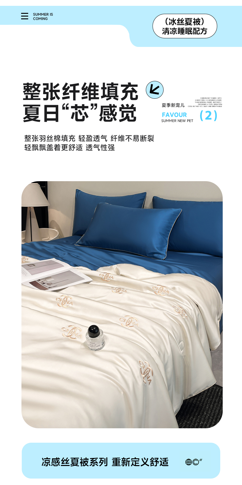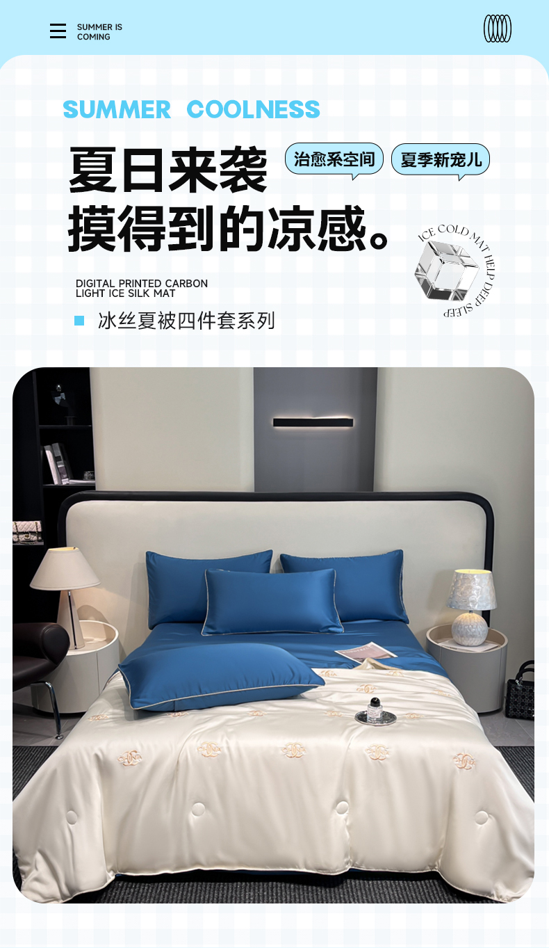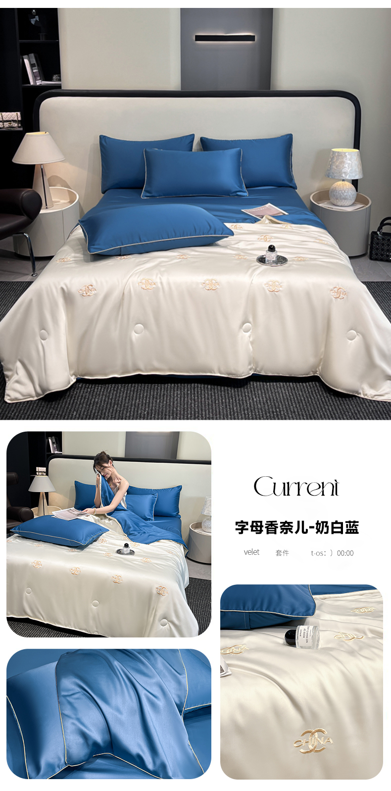当前位置: 91家纺网 > 商品网购 > 床品套件 > 四件套 > 夏被四件套 > 鑫顺欣 2025新款水洗冰丝刺绣麻绳系列凉感夏被四件套夏凉被 字母香奈儿-奶白蓝
