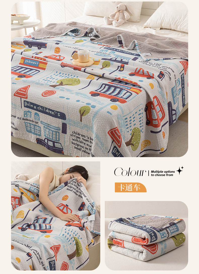 商品名称:乐家毛巾被(工厂自产自销) 2025春夏新款三层全棉纯棉印花毛巾被 卡通车