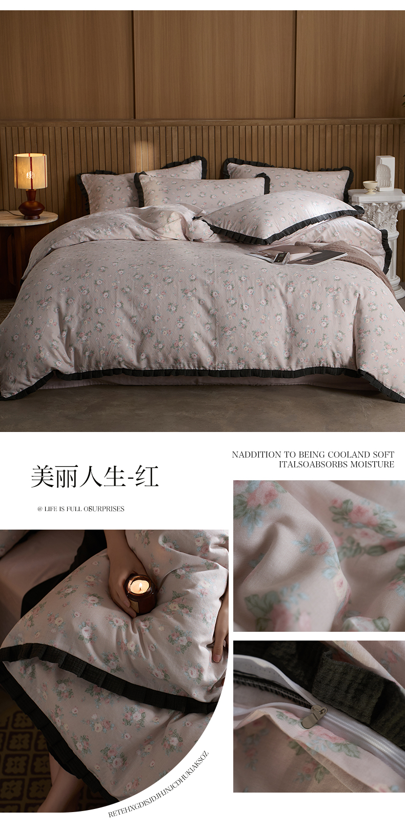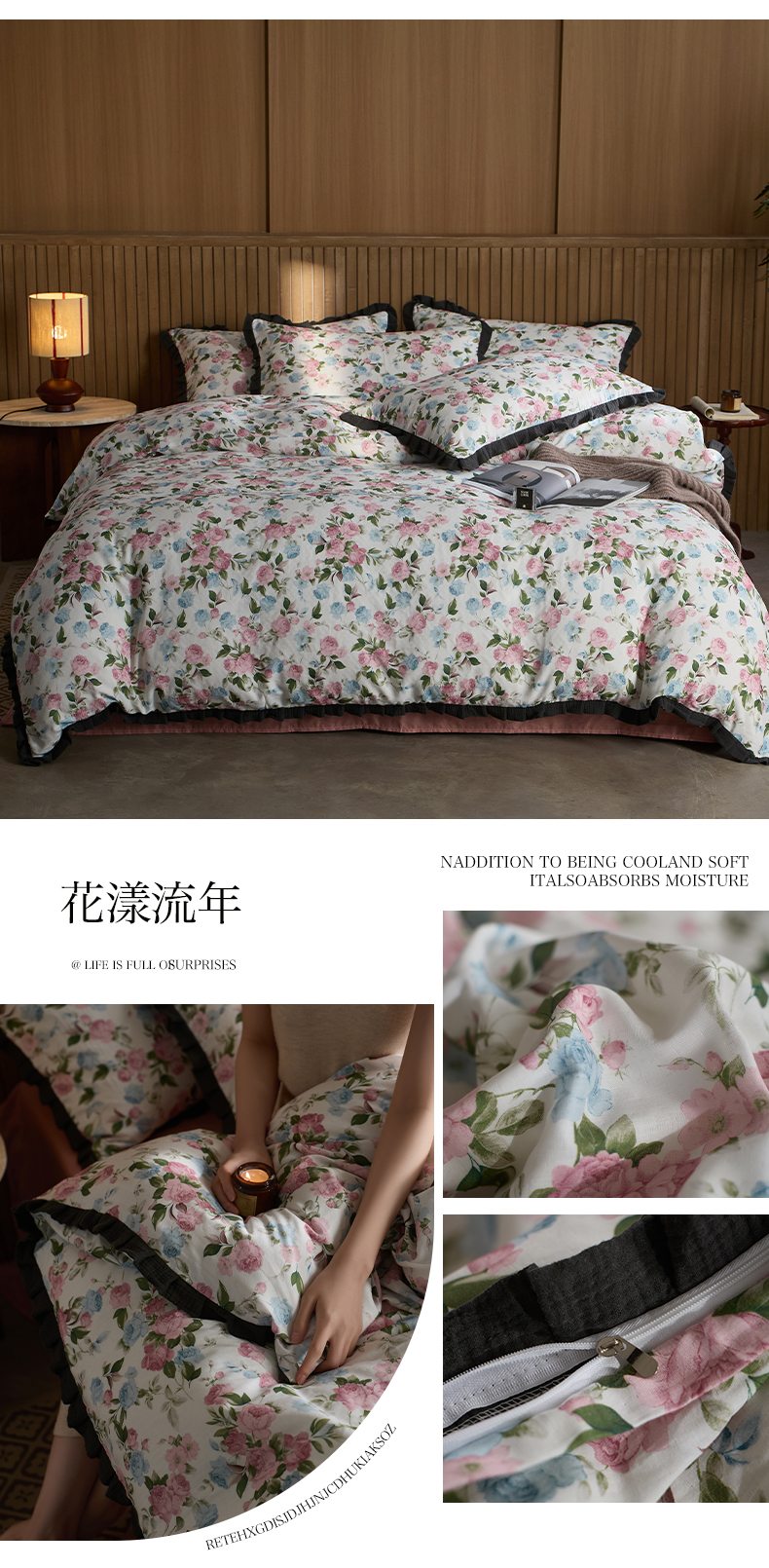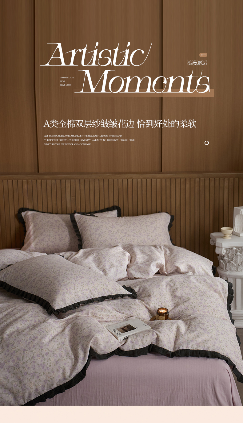 商品名称:蓝邻家纺 2025新款全棉纯棉双层纱绉绉花边四件套系列 花漾流年