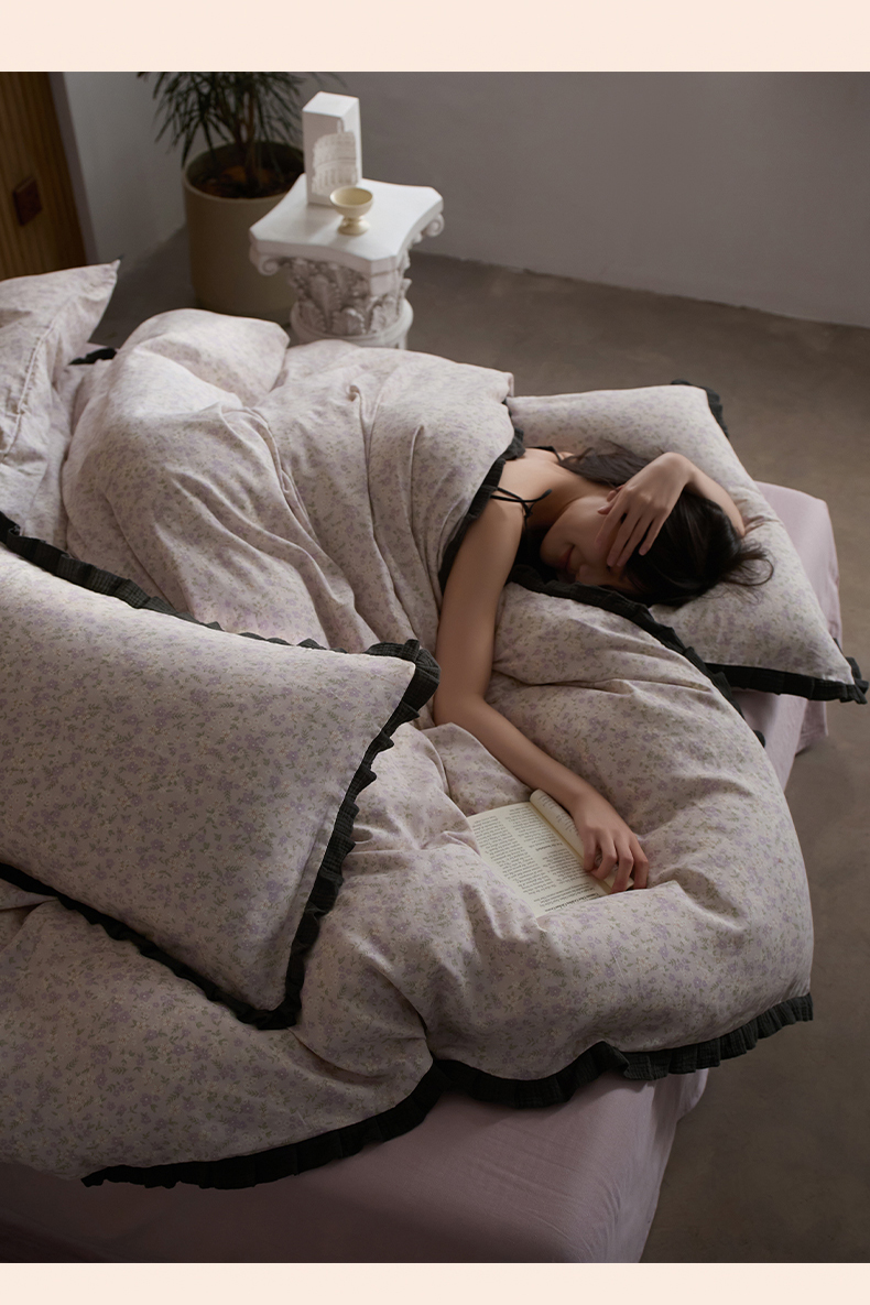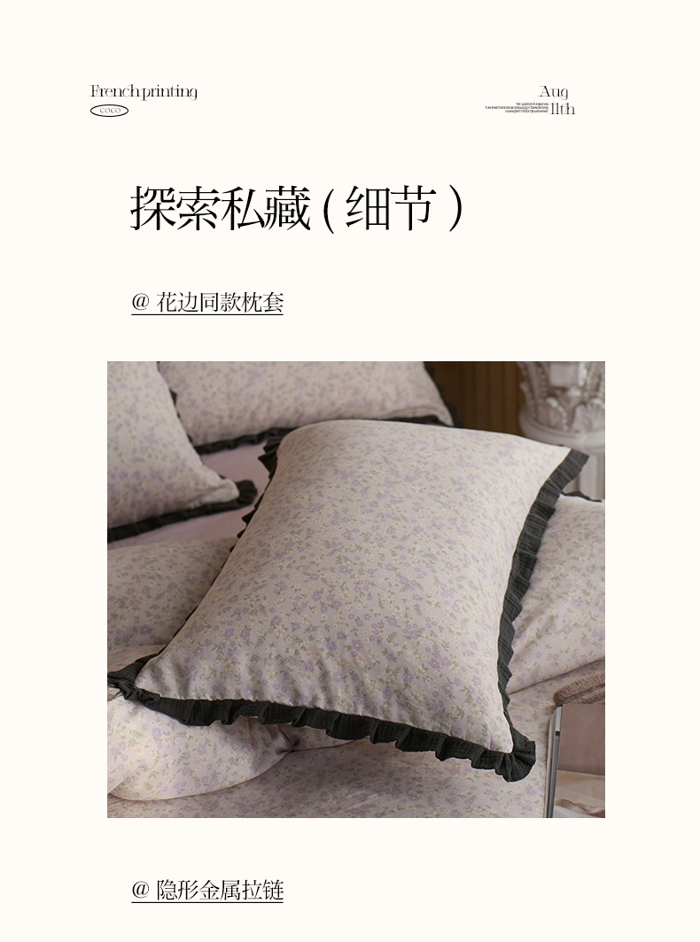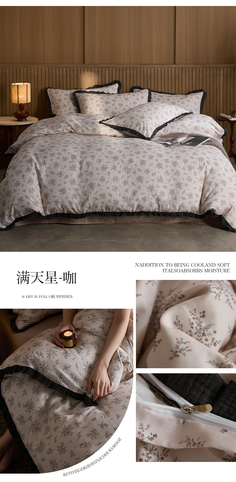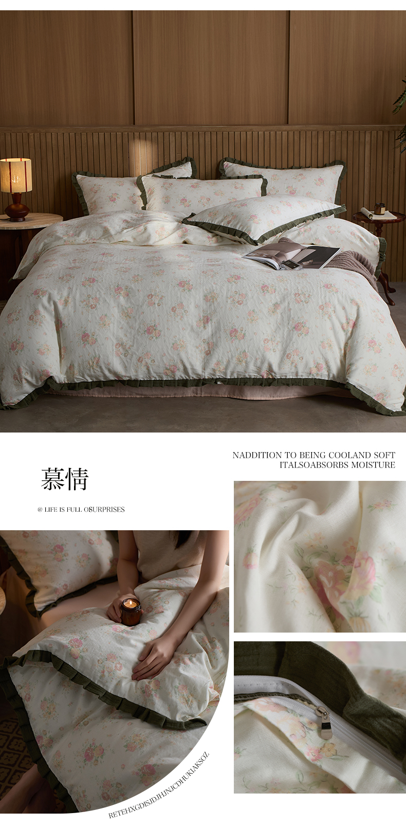 商品名称:蓝邻家纺 2025新款全棉纯棉双层纱绉绉花边四件套系列 花漾流年