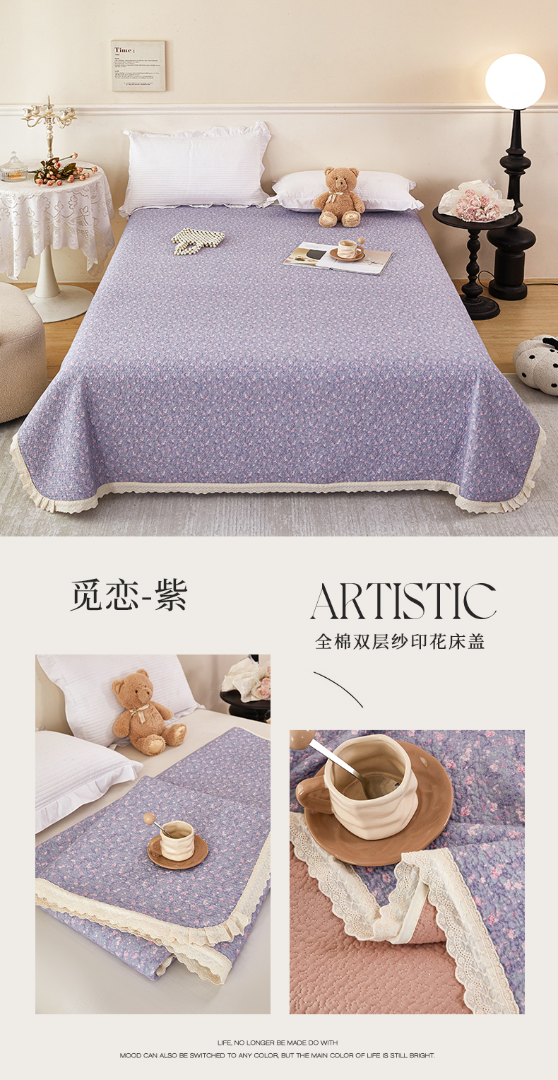 瑞米家居 2025新款全棉双层纱印花床盖 觅恋-紫