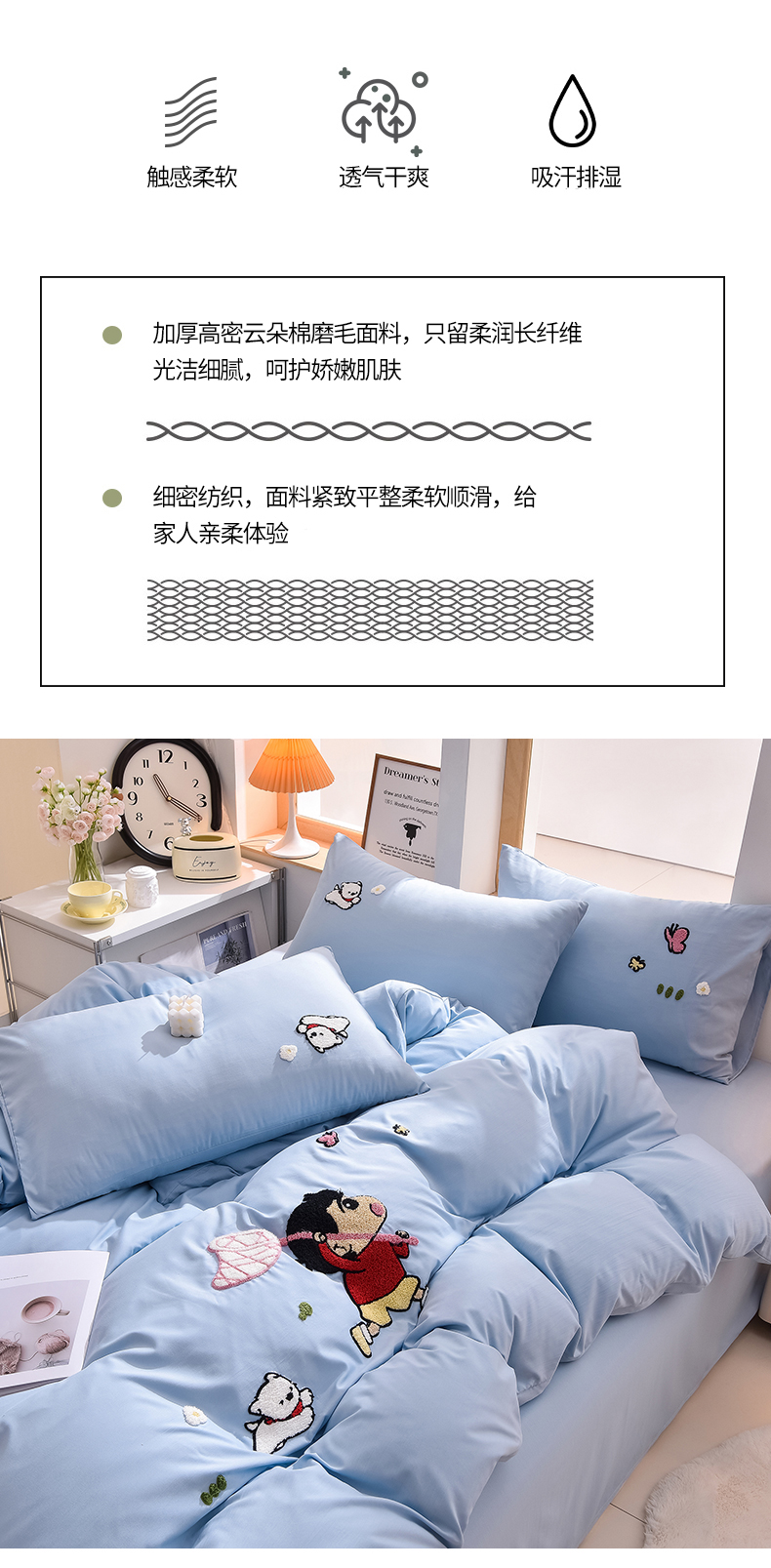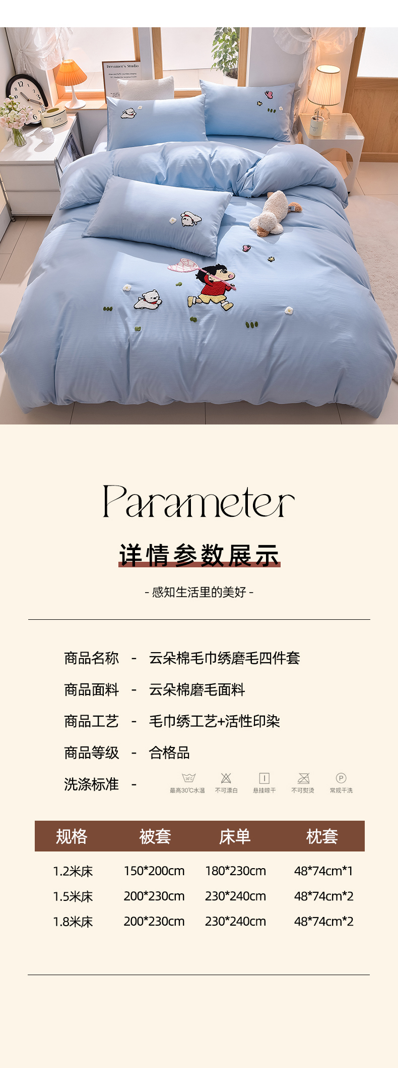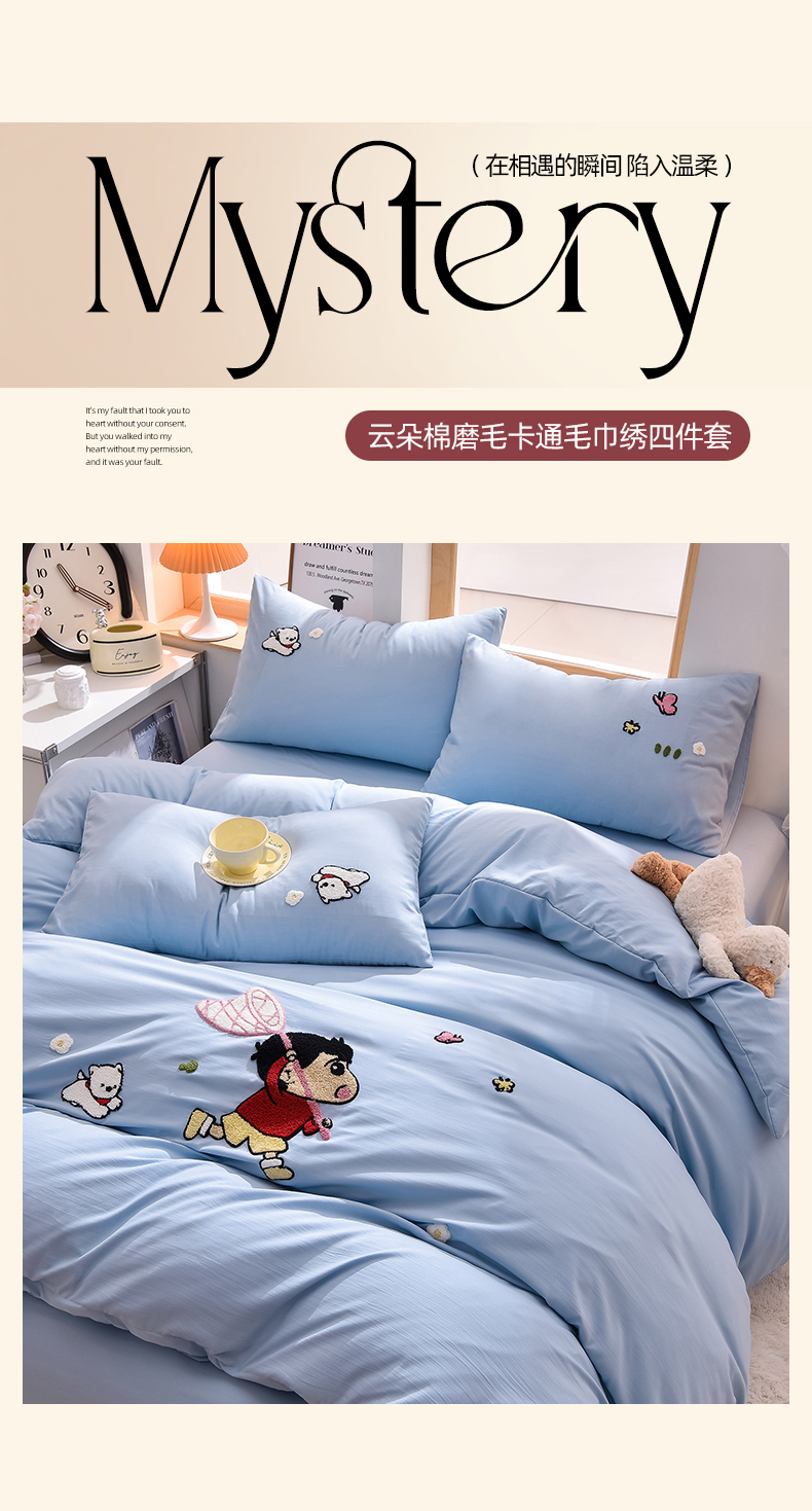 (总)乐窝家纺仓储 2025新款云朵棉毛巾绣磨毛四件套,蜡笔小新,KT猫,熊猫乐园,海绵宝宝