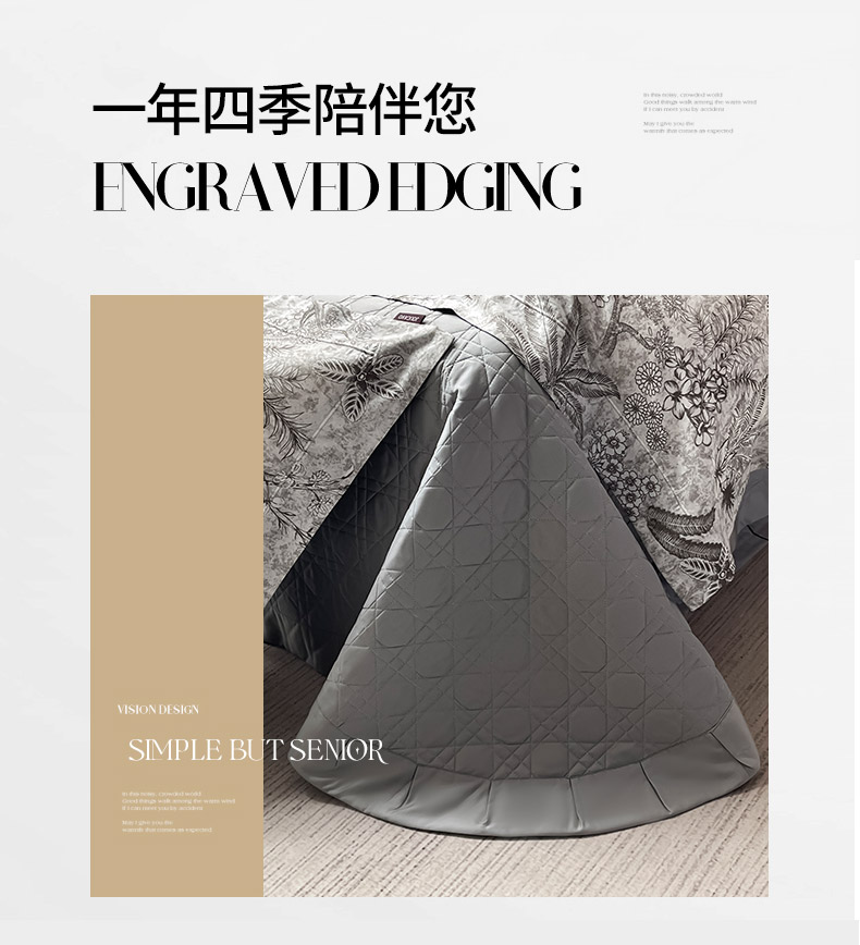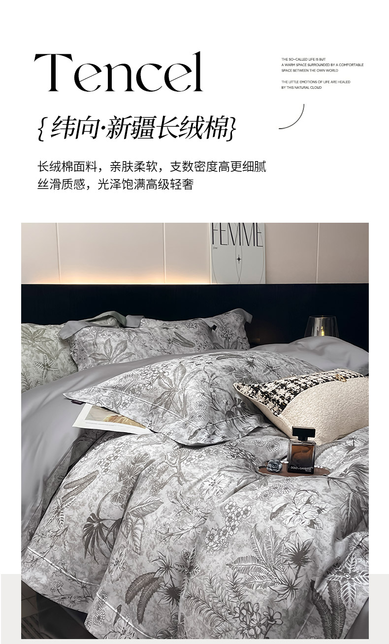 2025新品A类天丝棉夹棉床盖床笠四件套全棉真丝保护罩高级感数码印花床上用品 丽芙-灰