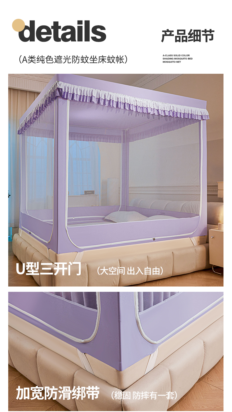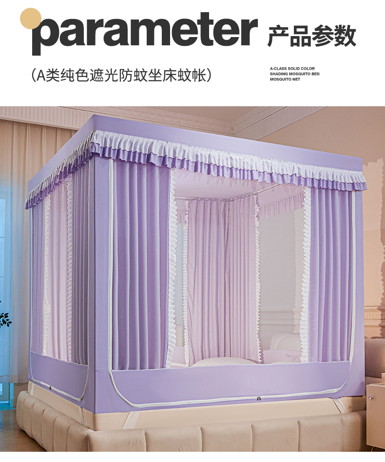 当前位置: 91家纺网 > 商品网购 > 床上用品 > 蚊帐 > 坐床式蚊帐 > 浪幔纱蚊帐 2025新款A类遮光防摔蚊帐坐床拉链全底回底纯色加厚支架 优雅紫【回底带帘款】
