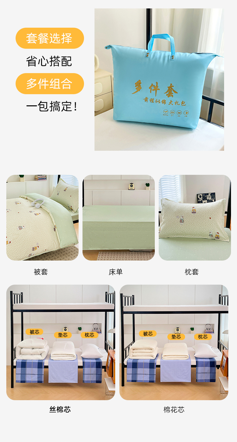 六件套:【三件套+4斤羽丝绒被子+4斤羽丝绒床垫(90*200)+枕芯】 | ¥150.00 |