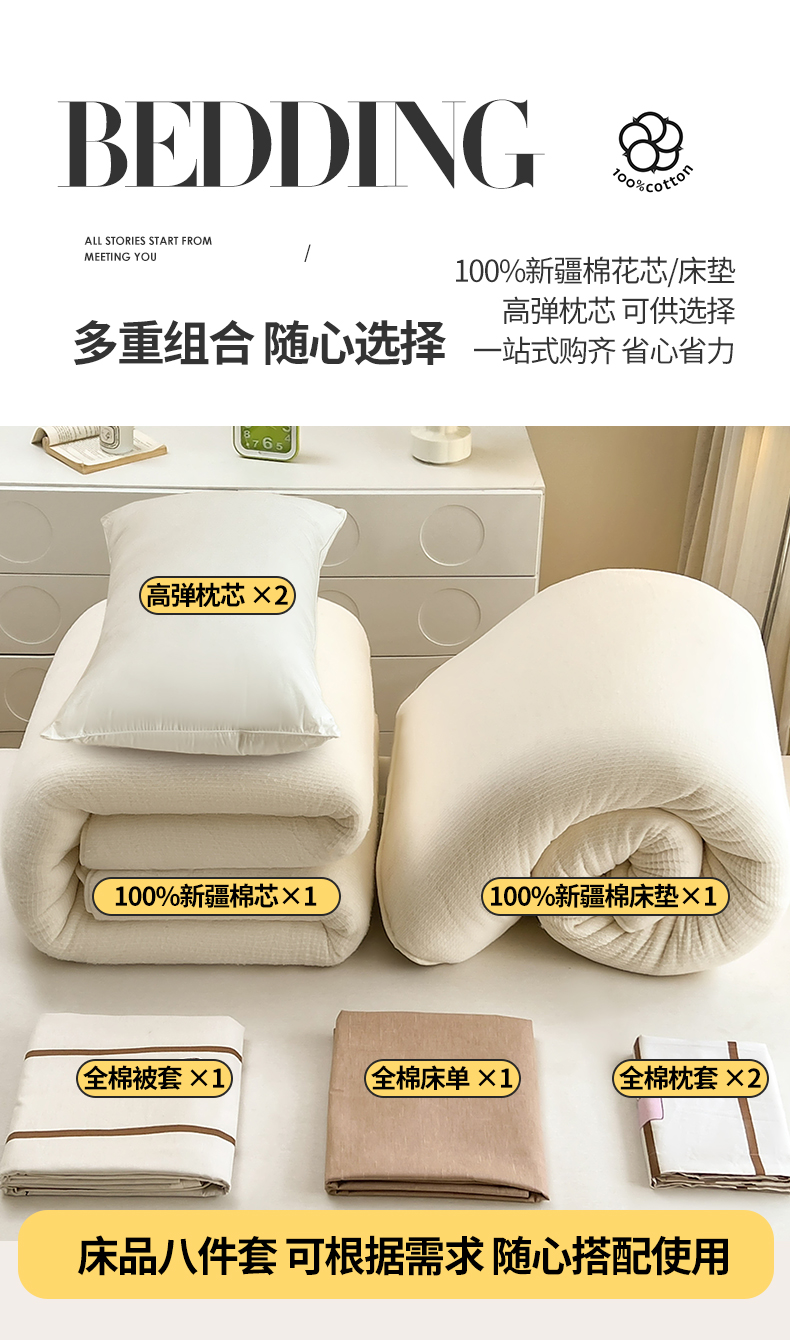 西域种棉人·千百笠 2025新款全棉纯棉大学生宿舍100%新疆棉花被子被褥一整套枕头床垫三件套六件套 猫咪晚餐