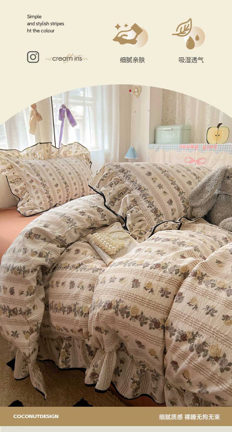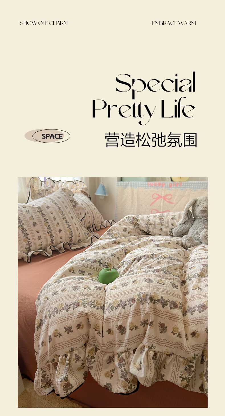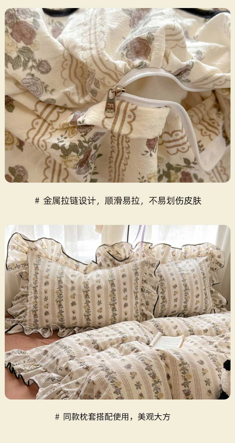 当前位置: 91家纺网 > 商品网购 > 床品套件 > 四件套 > 其它四件套 > 繁花家居 2025新款学生季韩式云感针织棉大花边木耳边四件套 玫瑰庄园