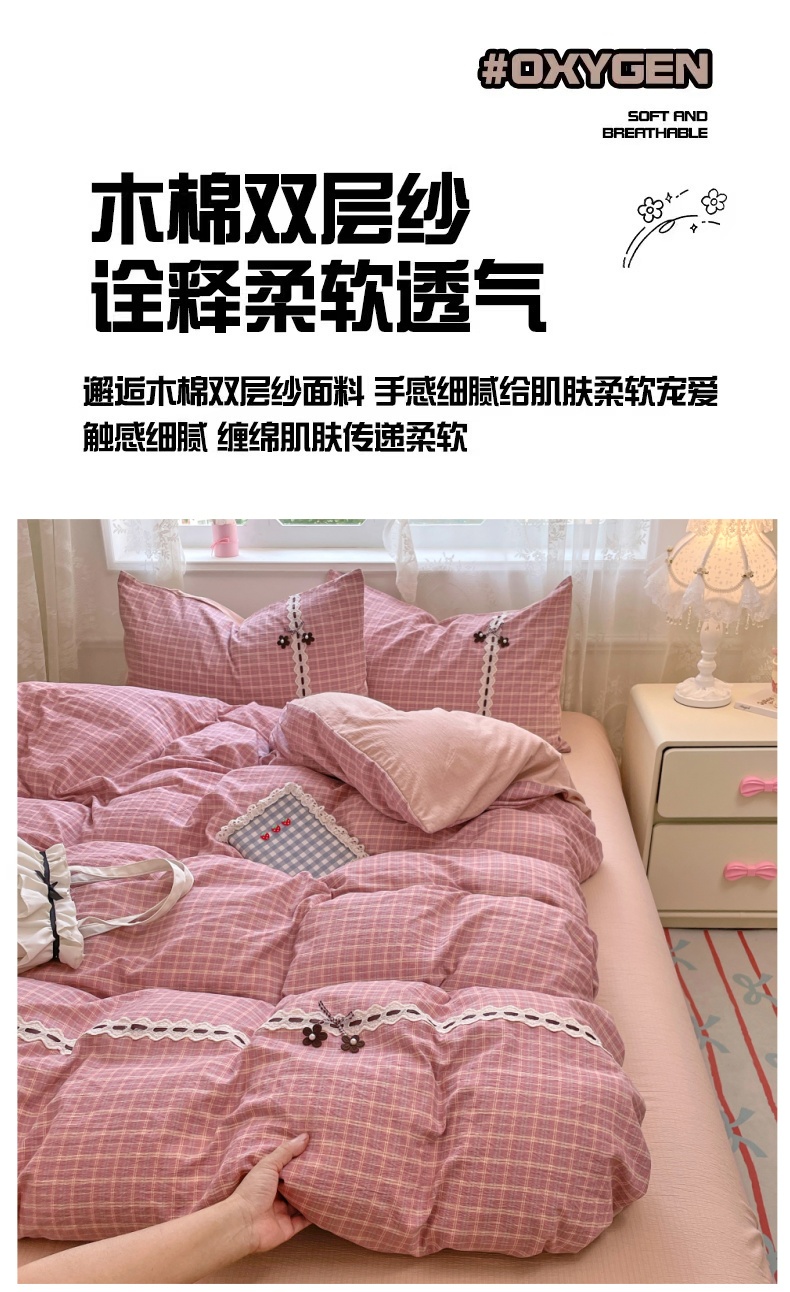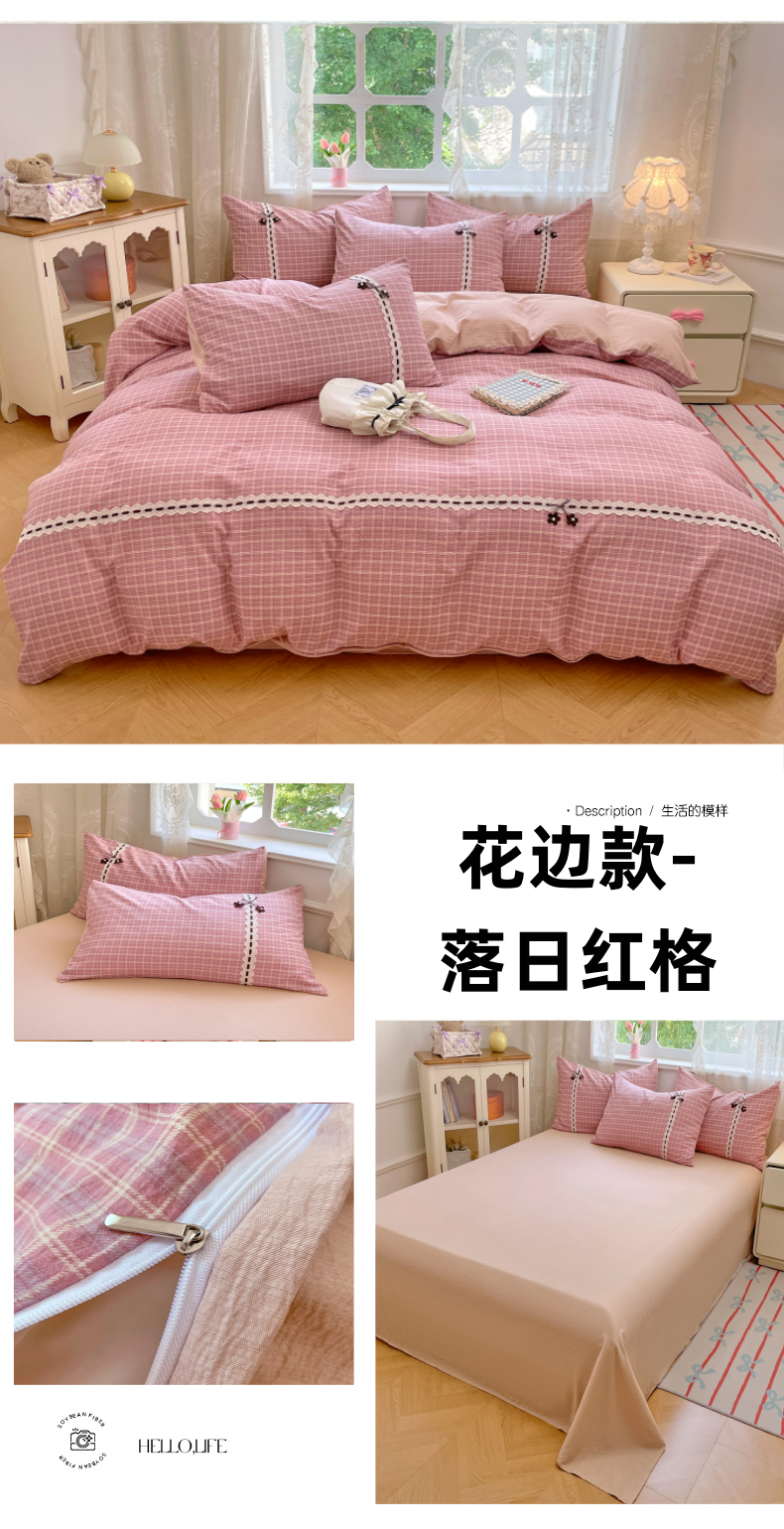 当前位置: 91家纺网 > 商品网购 > 床品套件 > 四件套 > 双层纱四件套 > 梦舒羽2025新款双层纱蕾丝花边四件套学生宿舍床单款床上用品四件套 蕾丝花边-落日红格