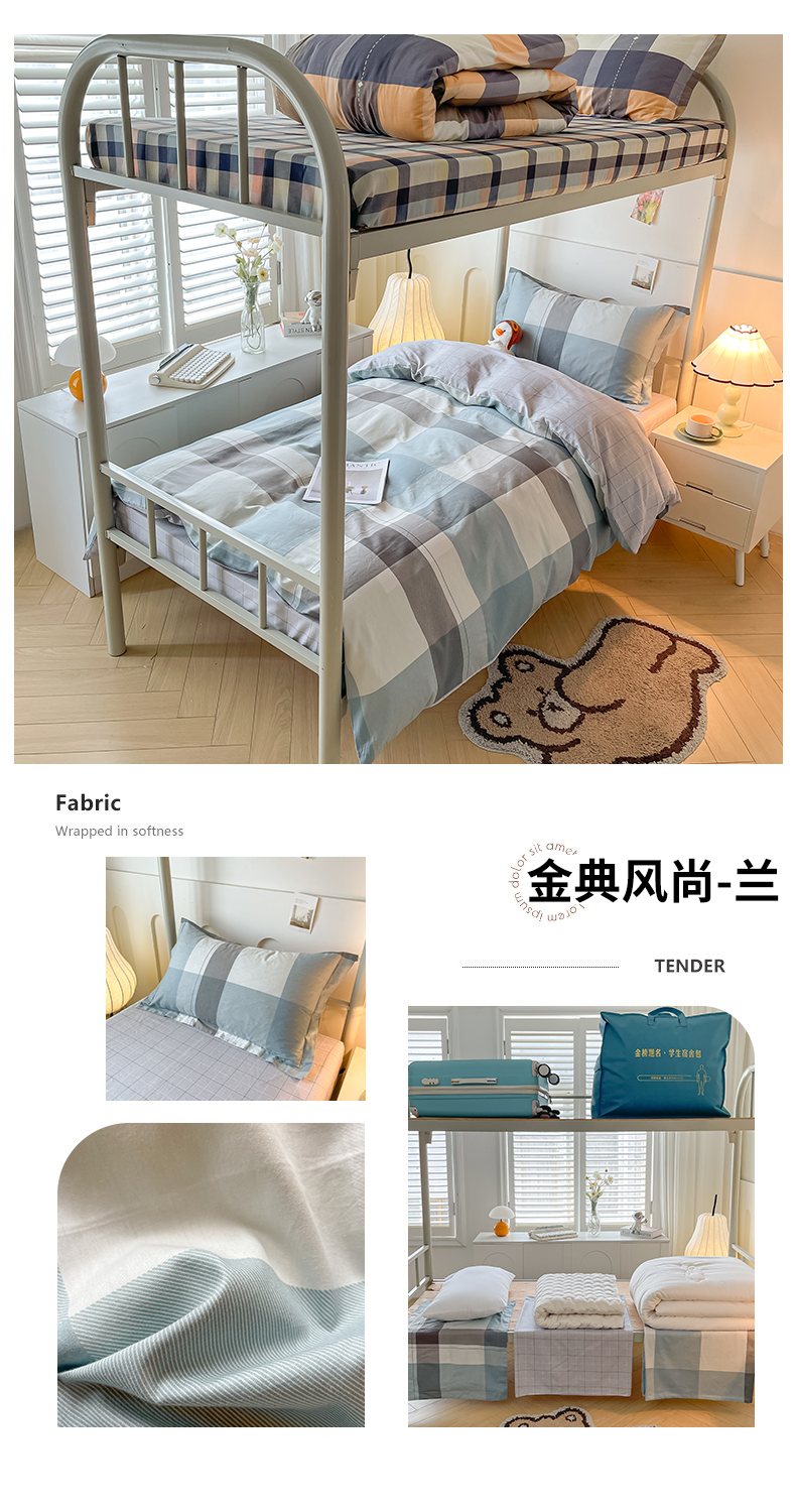 当前位置: 91家纺网 > 商品网购 > 床品套件 > 三件套 > 慕木家纺 2025新款12868全棉印花学生上下铺三件套大礼包系列 经典风尚-兰