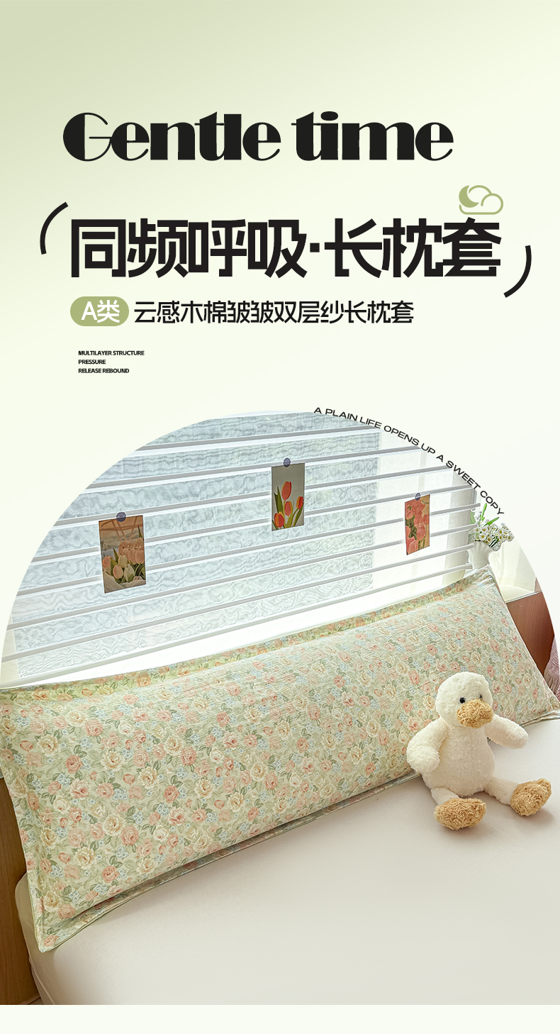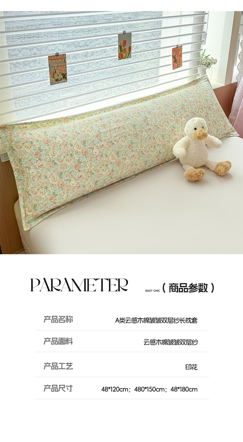 (总)麦田家纺 2025新款云感木棉皱皱双层纱长枕,春意浓,繁花,花颜,开心小熊,腊肠犬,浪漫花语,甜心格,小蓝町,樱桃格,紫韵,纯白