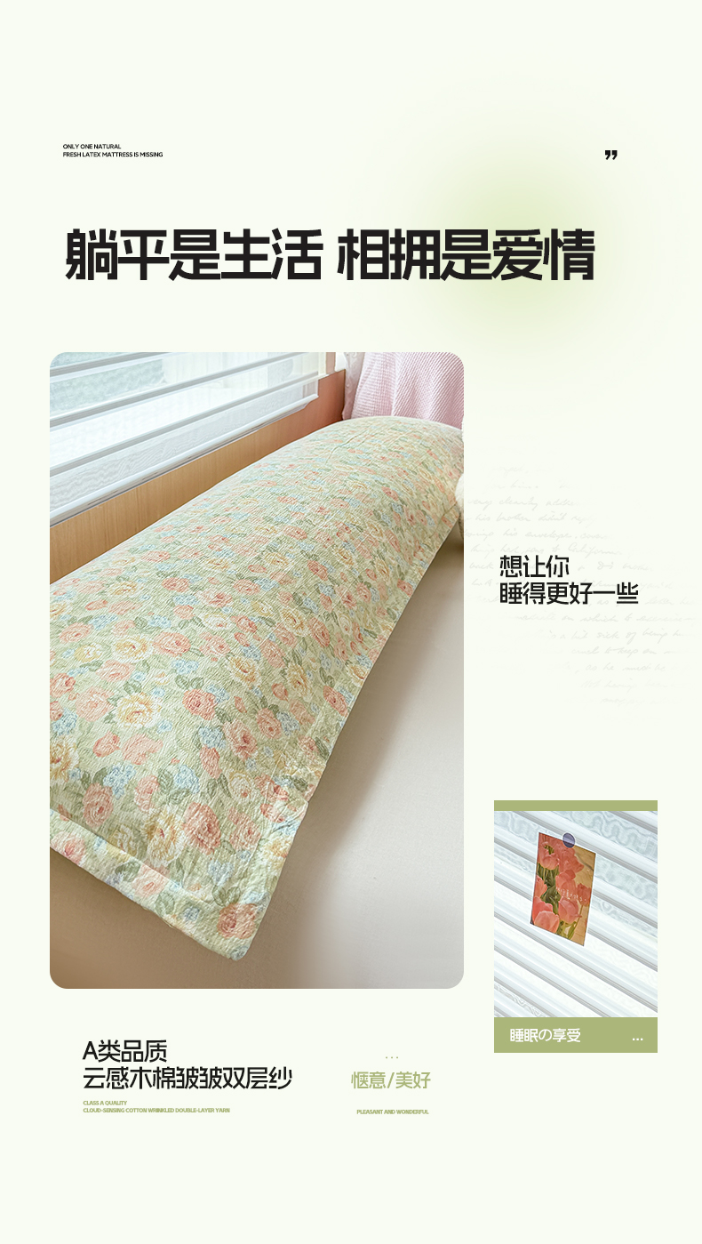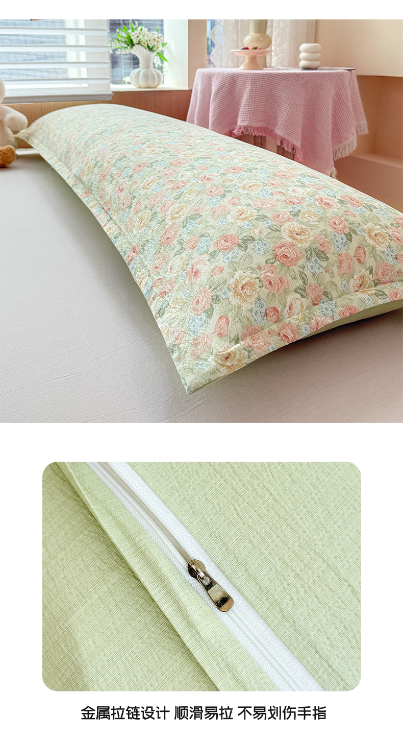 商品名称:麦田家纺 2025新款云感木棉皱皱双层纱长枕 春意浓