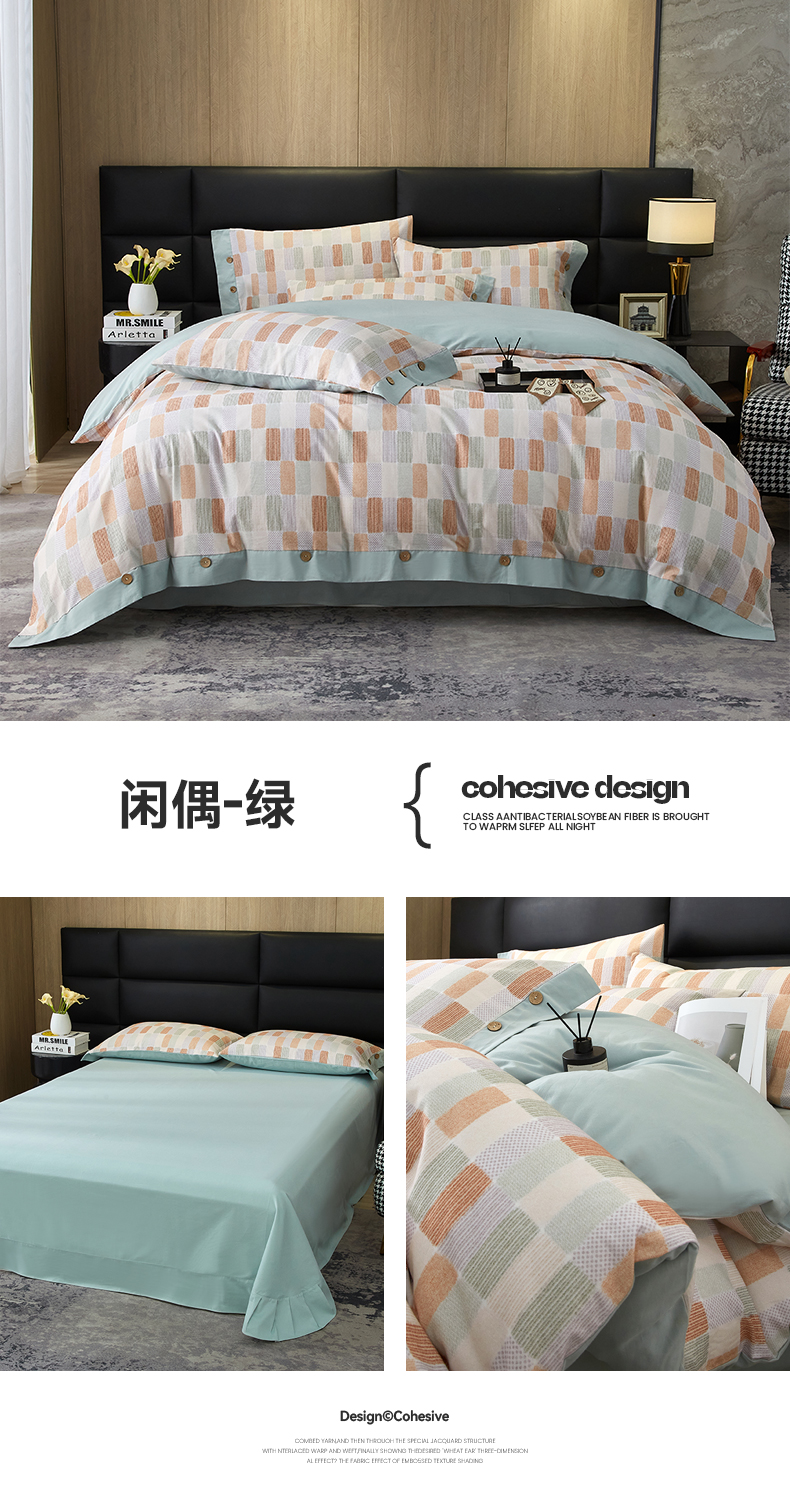 商品名称:沐白家居 2025新款全棉生态磨毛印花四件套-纽扣工艺款 闲偶-绿