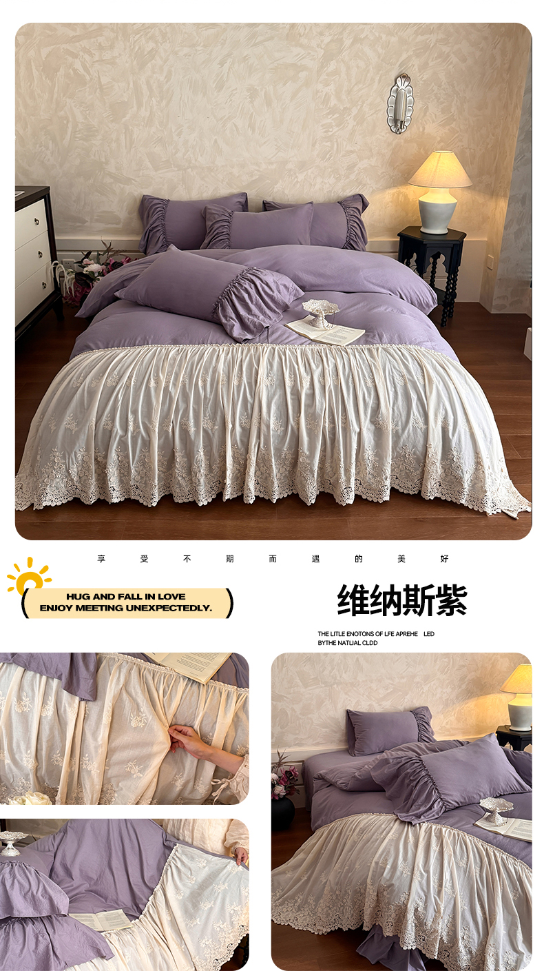 商品名称:吾欢心 2025新款韩版纯棉花边款加厚原棉四件套维纳斯(高端定制) 维娜斯紫