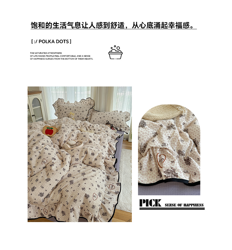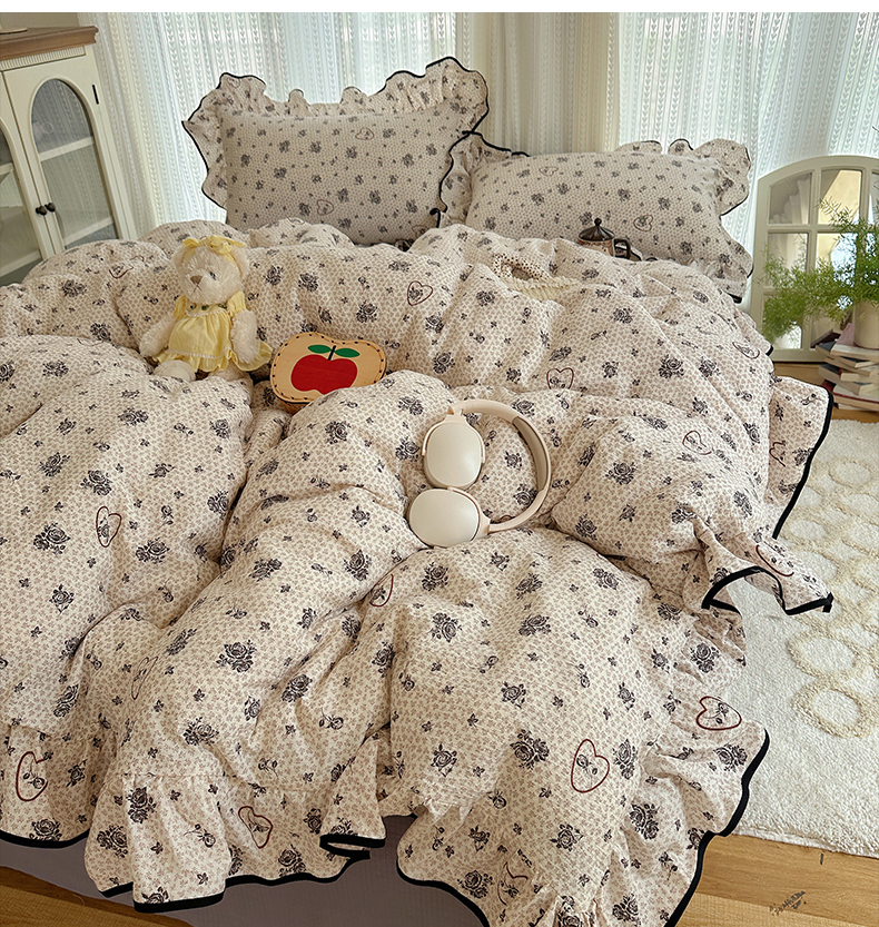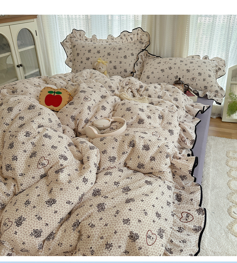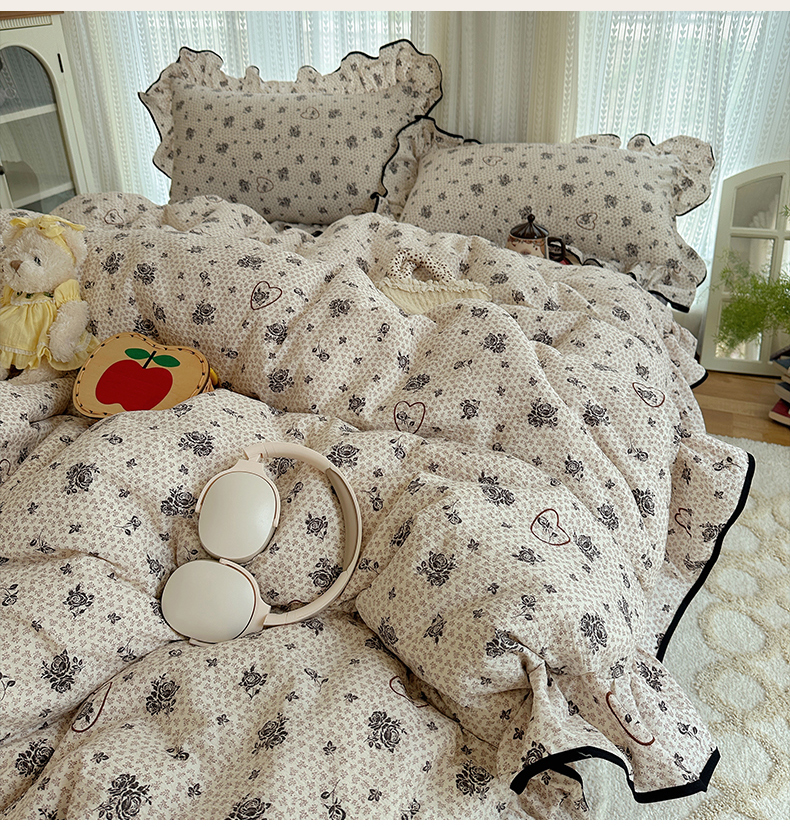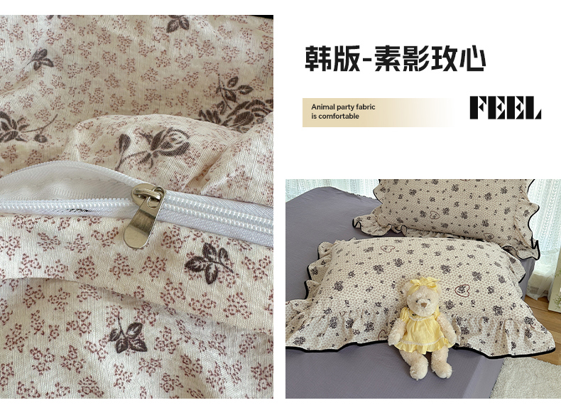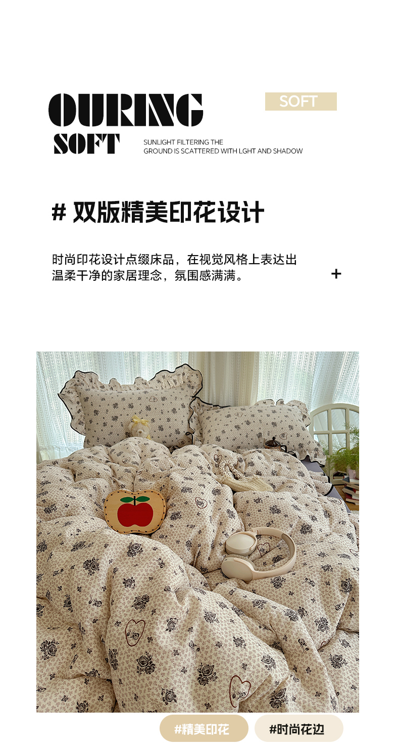 商品名称:红嘴企鹅 2025新款韩版双拼花边四件套 韩版-素影玫心