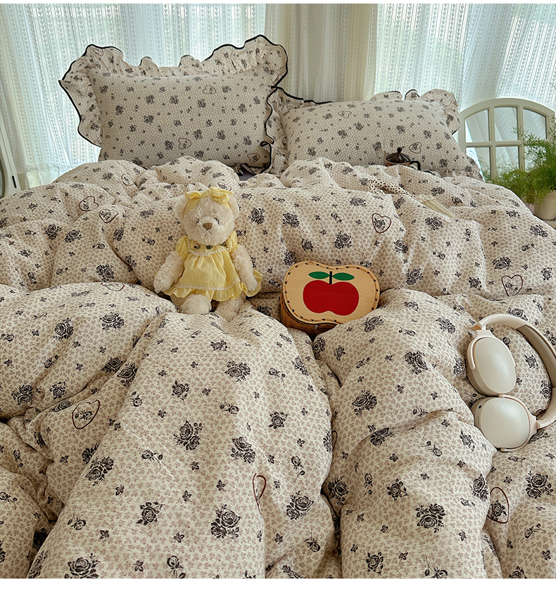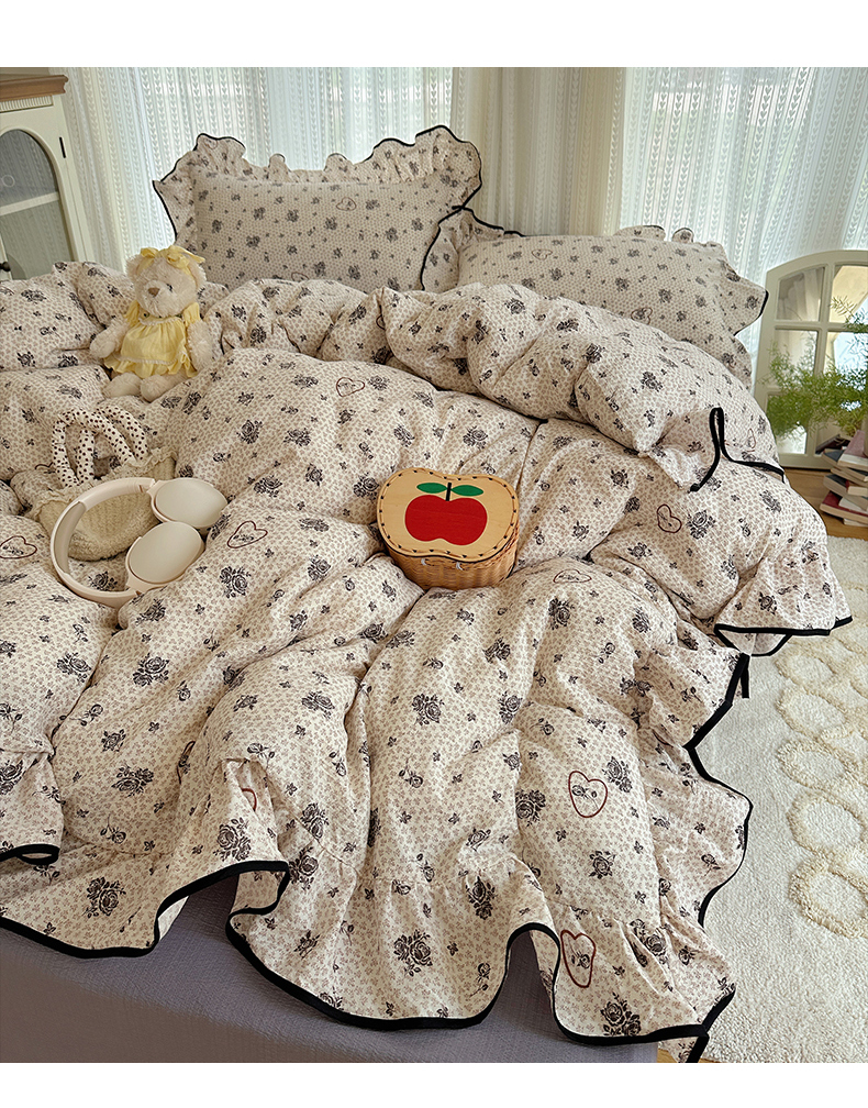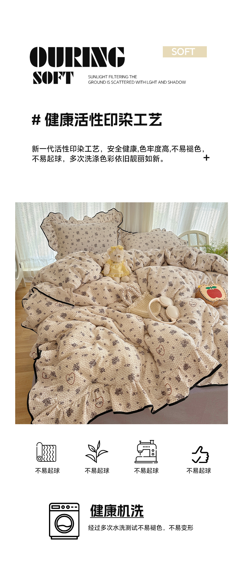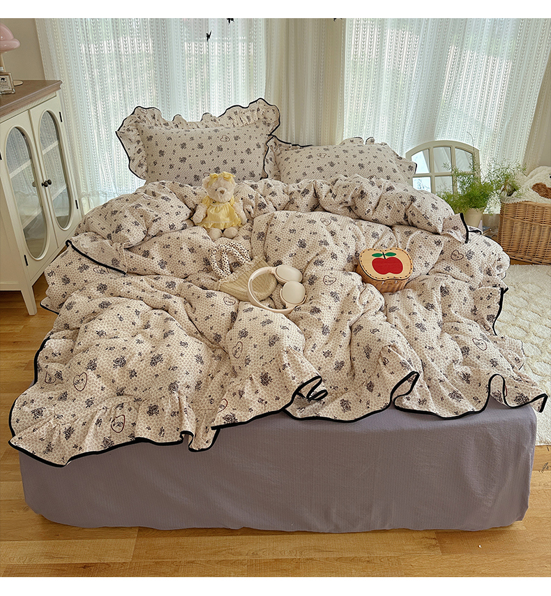 商品名称:红嘴企鹅 2025新款韩版双拼花边四件套 韩版-素影玫心