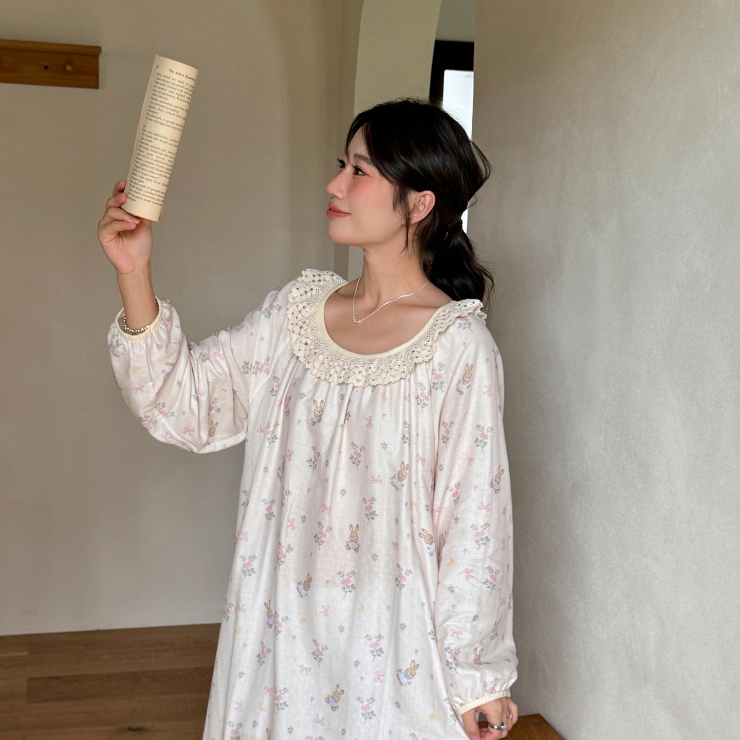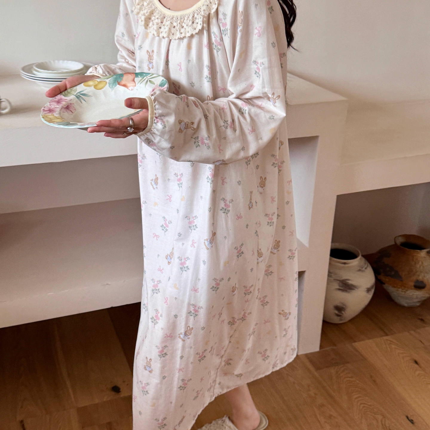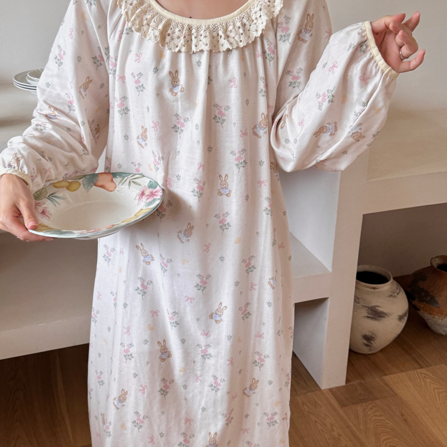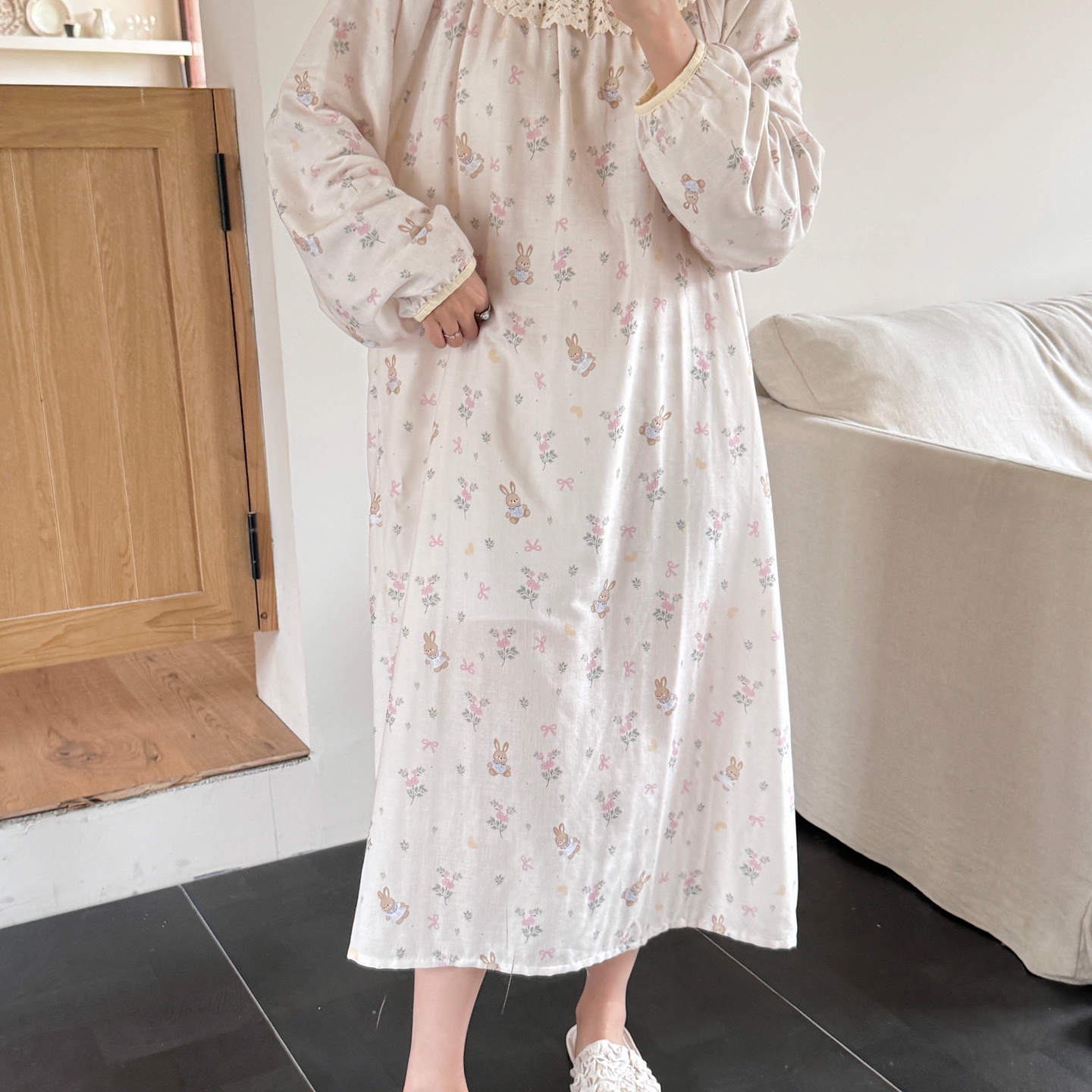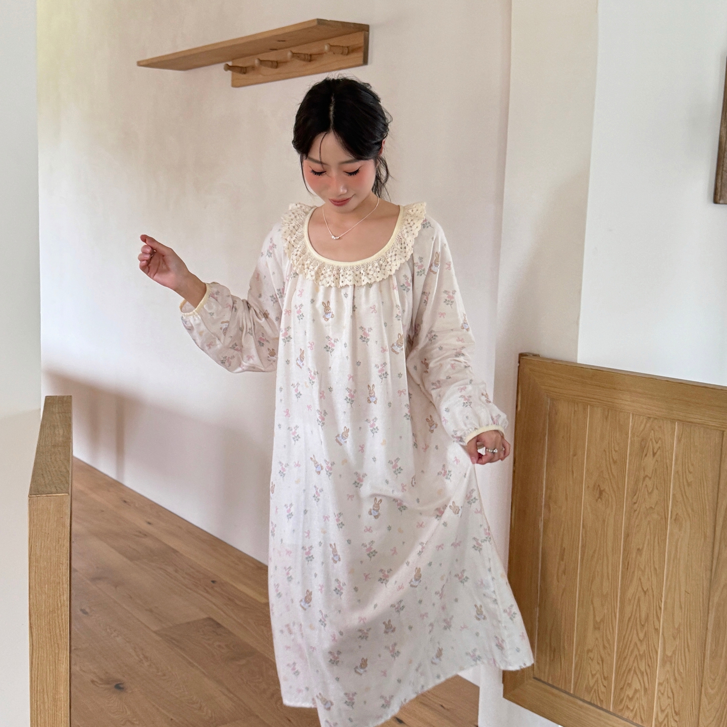 当前位置: 91家纺网 > 商品网购 > 居家日用 > 睡衣/家居服套装 > 纽约生活 2025新款有氧纱蕾丝长袖裙(会员-5) 花园兔