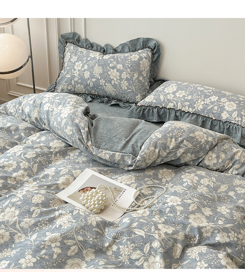 商品名称:逸林家纺《原希尔顿逸林》 2025秋冬新品加厚高克重亚麻复古原麻皱皱纱印花四件套法式花边 满园花开