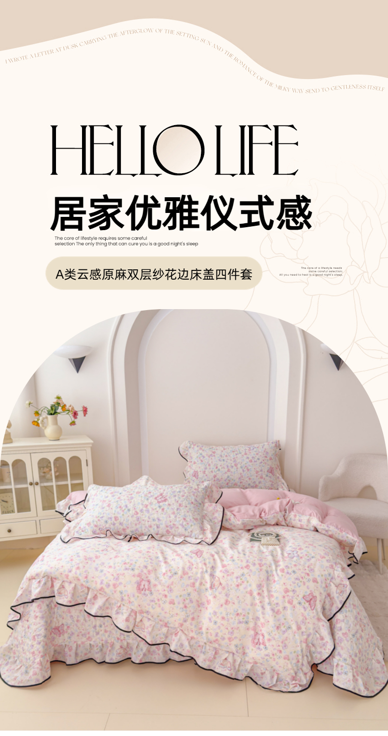(总)小萌虎 2025新款A类云感原麻双层纱花边床盖四件套,初见【花边款】,春天里【花边款】,蝶恋花【花边款】,蝴蝶梦【花边款】,花影【花边款】,静初【花边款】,兰黛【花边款】,漫花【花边款】,木兮【花边款】,慕情【花边款】,浅画【花边款】,寻梦粉【花边款】,寻梦紫【花边款】,樱桃格【花边款】,紫韵【花边款】