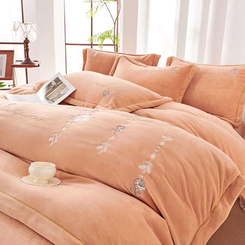 慕克斯 2025直播新款高克重8.5斤纯色刺绣牛奶绒四件套 朝花夕拾-浅橘,朝花夕拾-浅橘