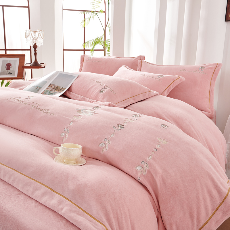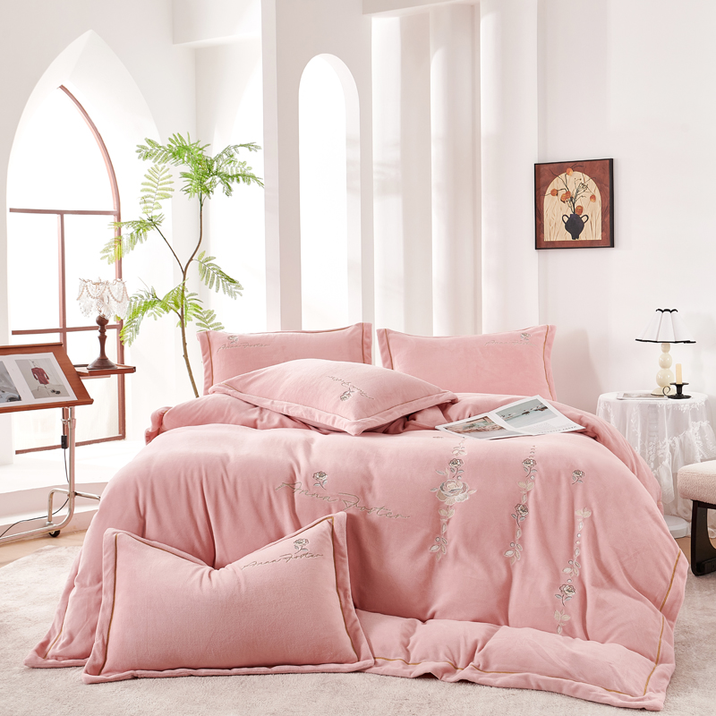 慕克斯 2025直播新款高克重8.5斤纯色刺绣牛奶绒四件套 朝花夕拾-寐粉,朝花夕拾-寐粉