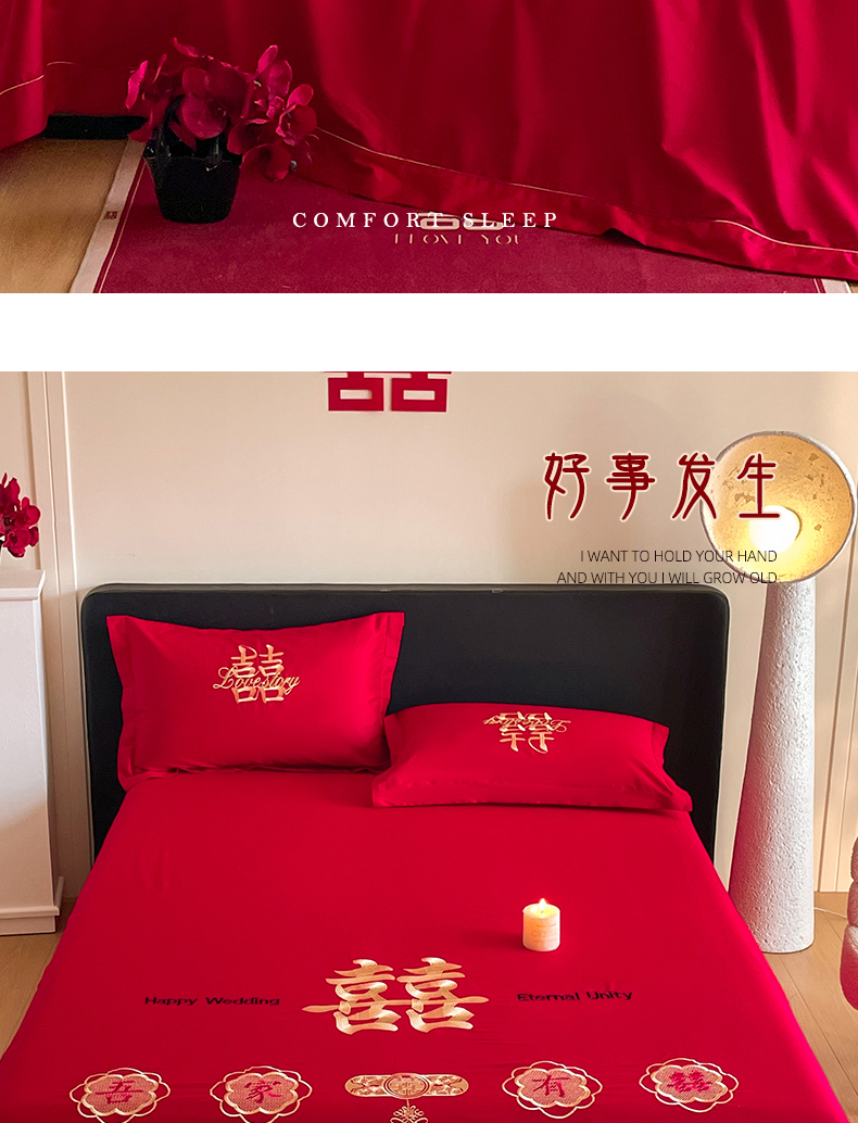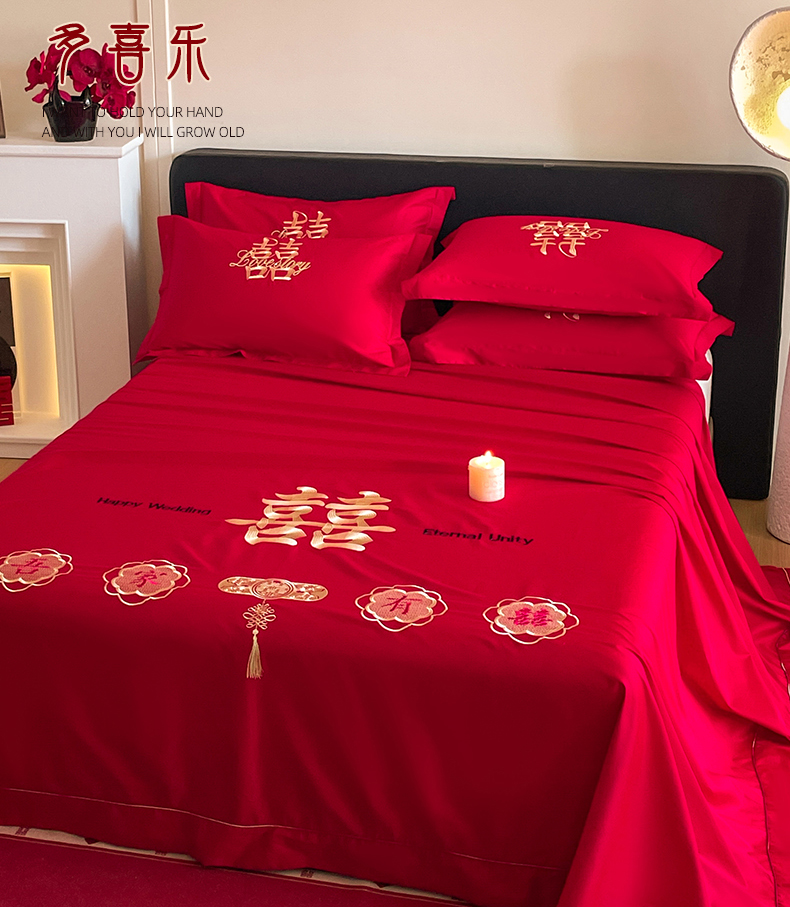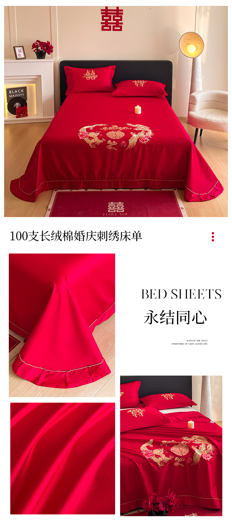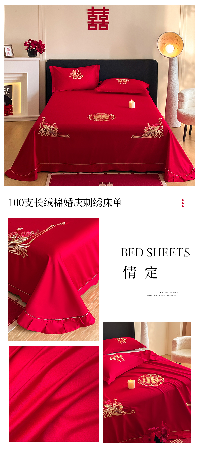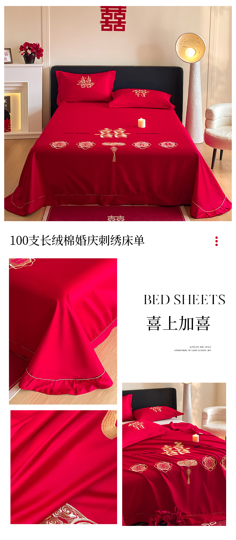 • 91家纺网 家纺一手货源 找家纺 玉雅家纺 2025新款100支长绒棉刺绣婚庆床单单件绣花三件套 长绒棉床单-喜上加喜
