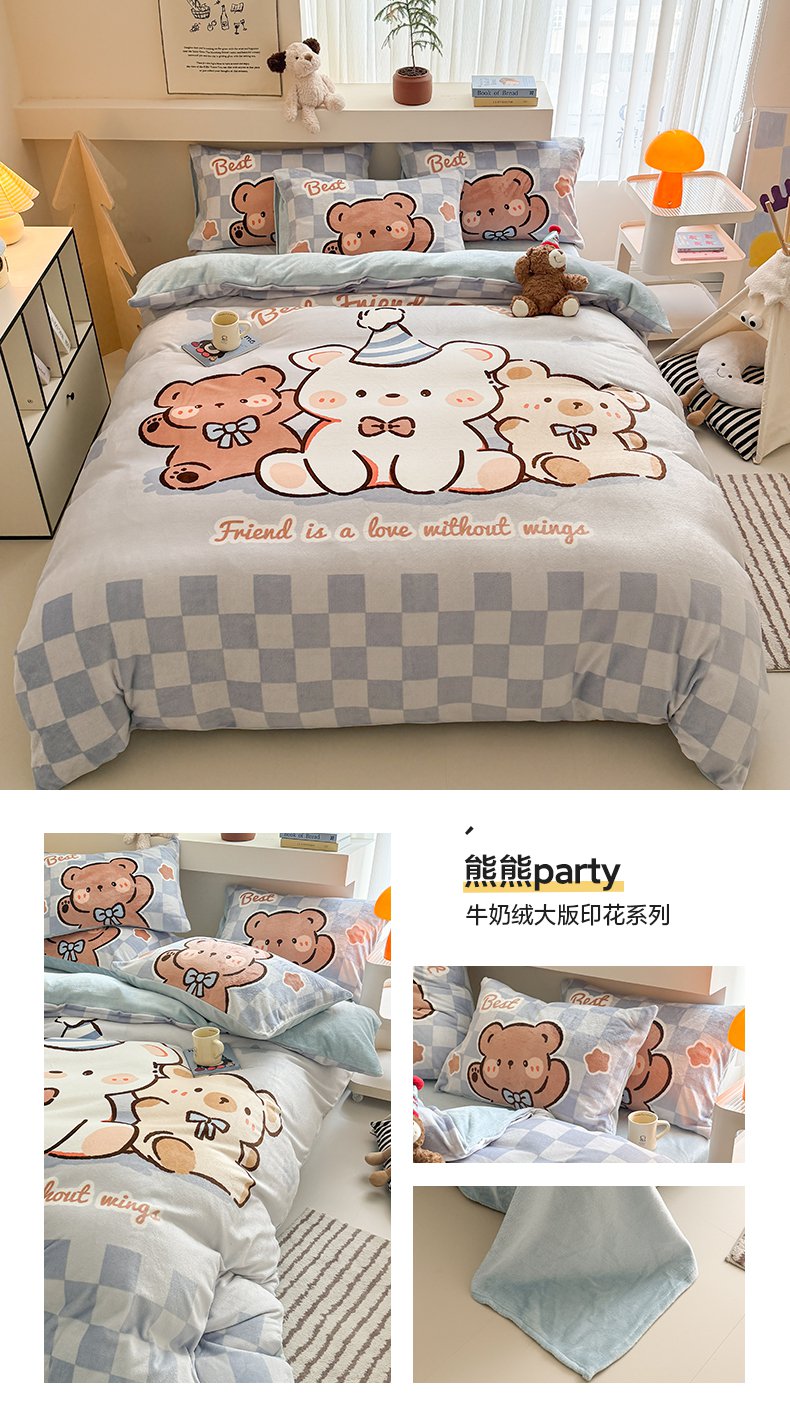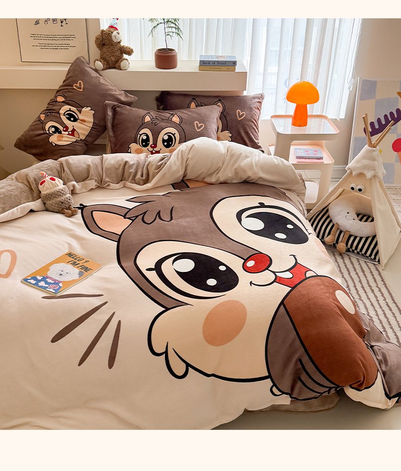 悦织湾家纺 2025新款大版卡通印花牛奶绒四件套儿童床绒套件学生宿舍单双人床上用品三四件套 可爱松鼠