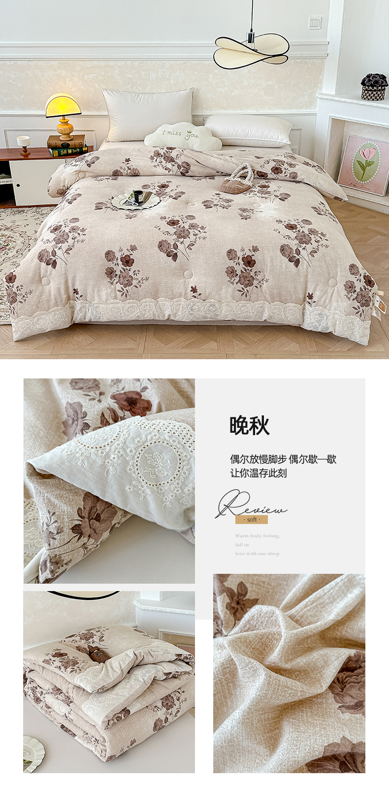 • 91家纺网 家纺一手货源 找家纺 芯恋 25年新款亚麻风全棉花边云感冬被四季被加厚冬被 晚秋