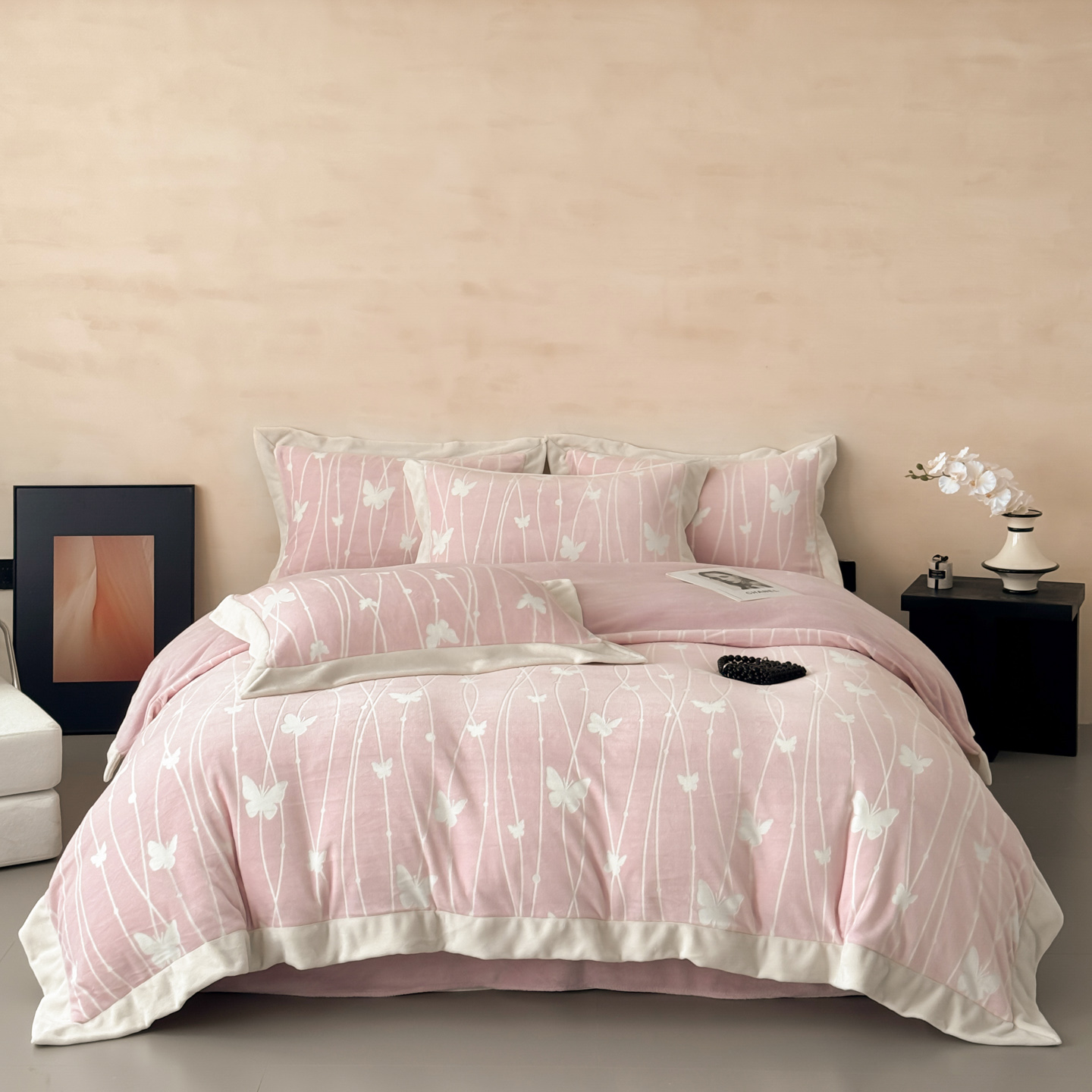 商品名称:若未家居 LOVEWE HOUSE 2025新款250克全消光数码印花和雕花大宽边全消光牛奶绒四件套-蝴蝶-薇薇安 蝴蝶-薇薇安 粉