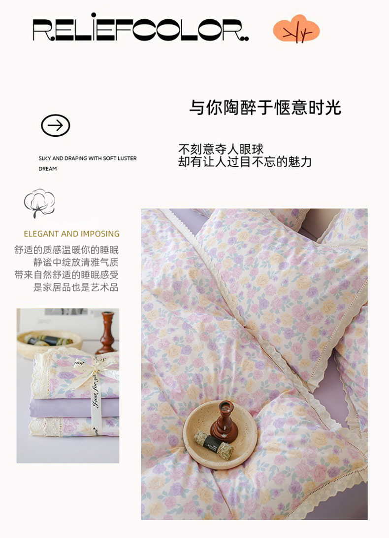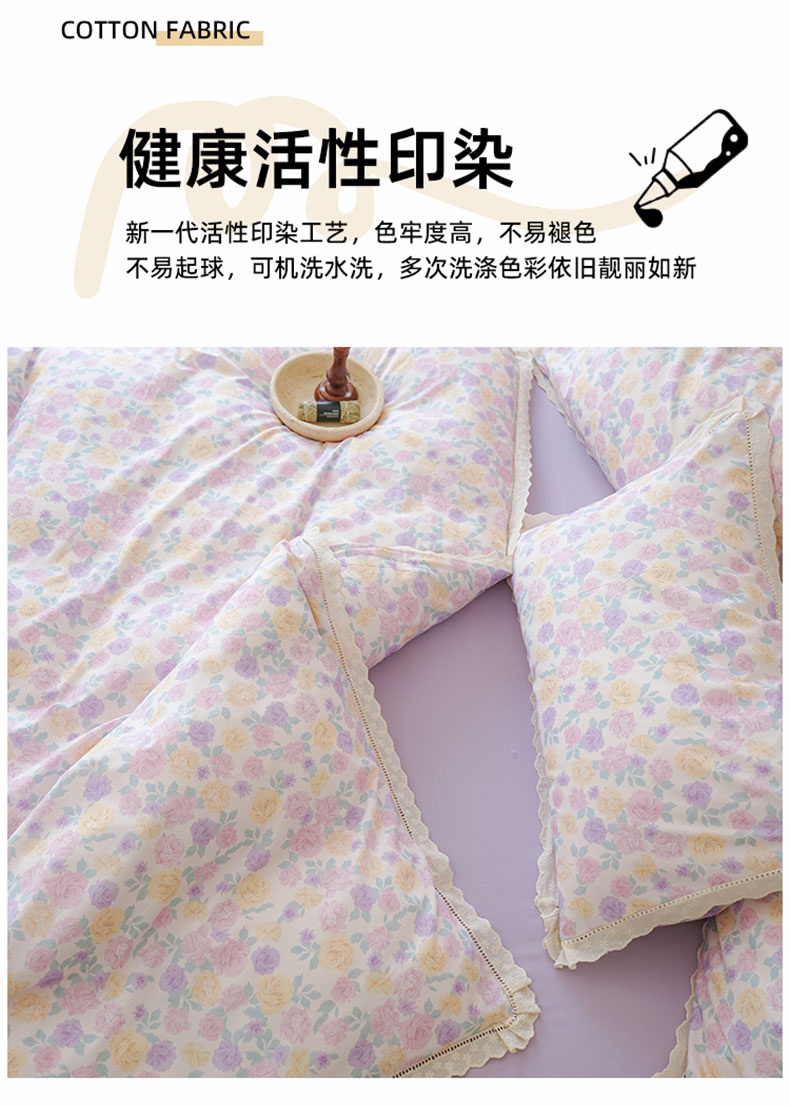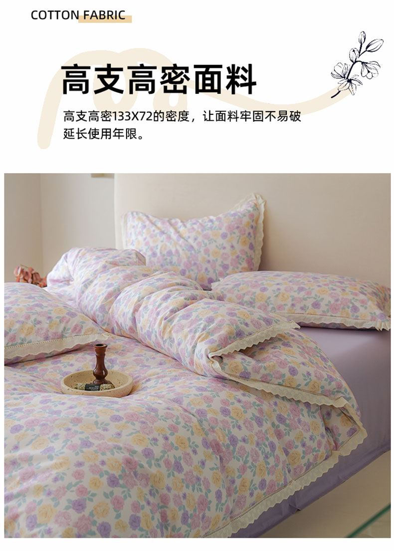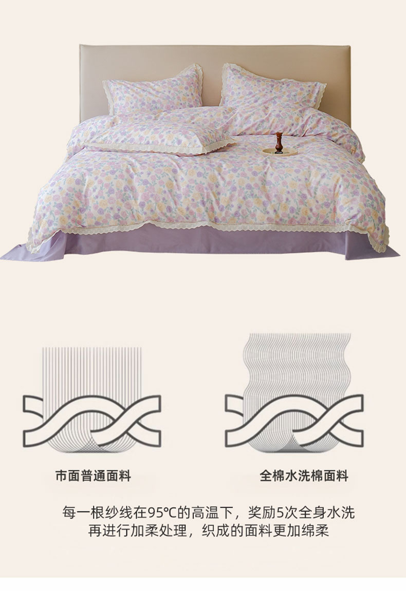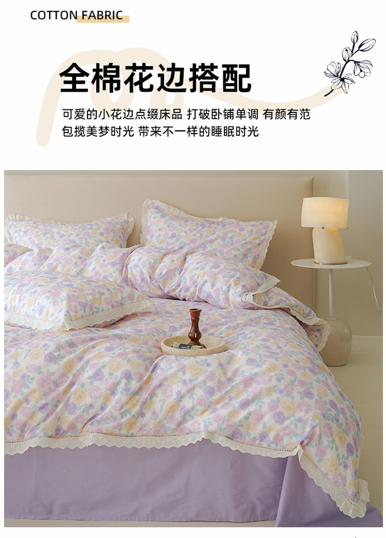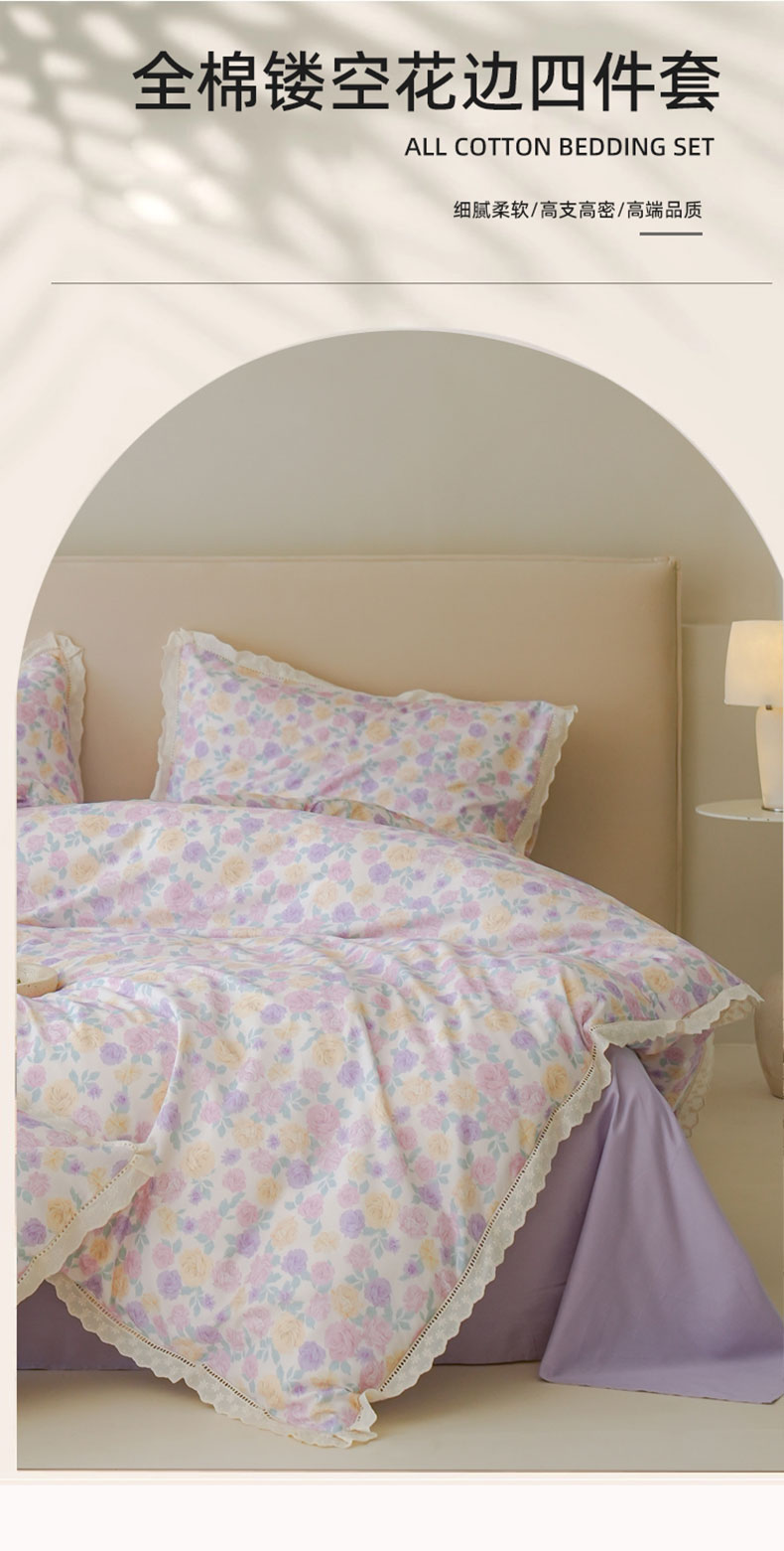 商品名称:洺兰家居 2025年小清新全棉13372镂空花边小碎花ins风水洗棉四件套 紫薇