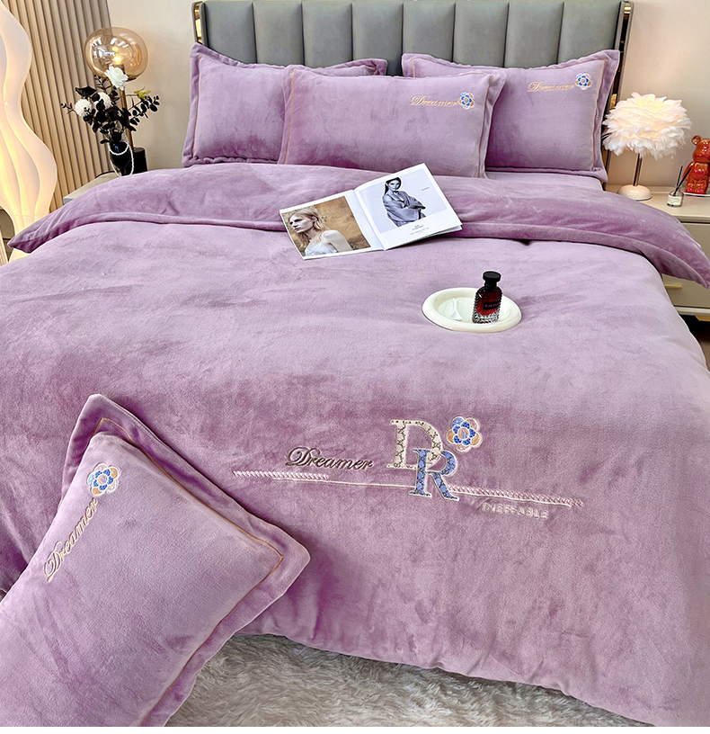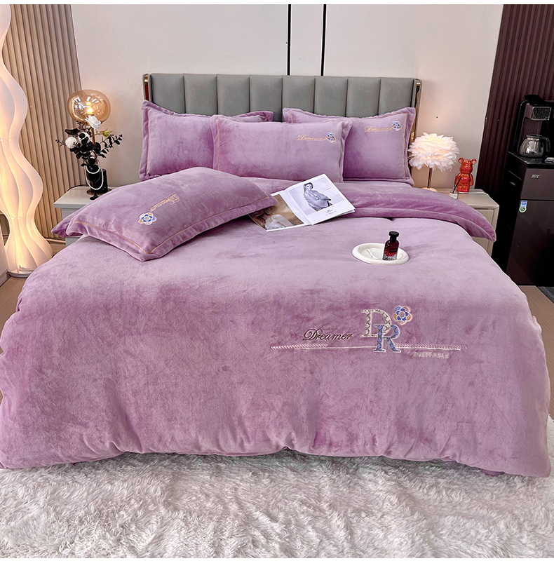 逸林家纺《原希尔顿逸林》 2025新款牛奶绒绣花四件套-可可系列 可可-香芋紫